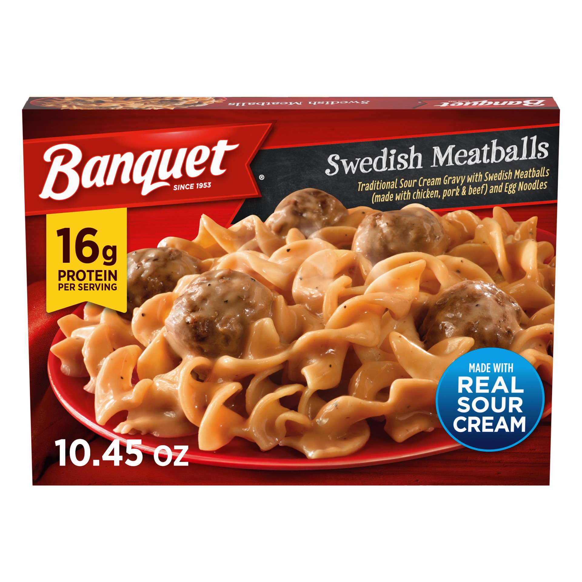 Banquet Swedish Meatballs frozen meal brings the home-cooked flavor to your table in minutes. This frozen dinner features traditional sour cream gravy with Swedish meatballs and egg noodles for delici…