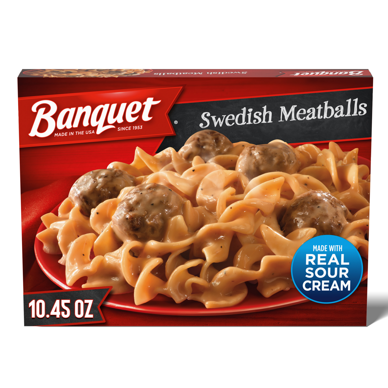 Banquet Swedish Meatballs frozen meal brings the home-cooked flavor to your table in minutes. This frozen dinner features traditional sour cream gravy with Swedish meatballs and egg noodles for delici…