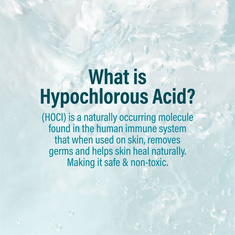 - HYPOCHLOROUS ACID: (HOCl) is a naturally occurring molecule found in the human immune system that when used on skin, it removes germs and helps skin heal naturally. Making it safe & non-toxic