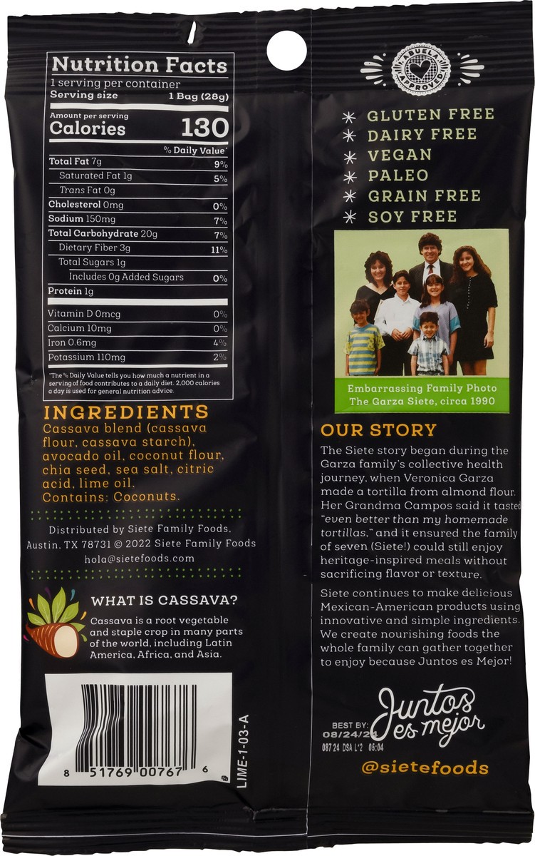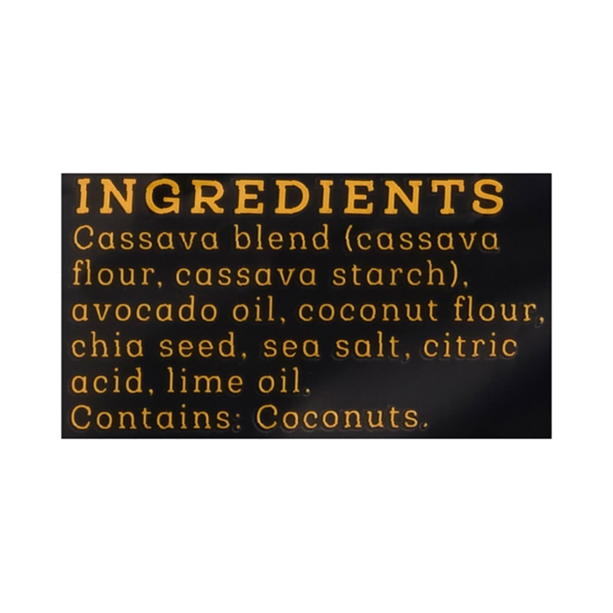 Cassava Blend (Cassava Flour, Cassava Starch), Avocado Oil, Coconut Flour, Chia Seed, Sea Salt, Citric Acid, Lime Oil.