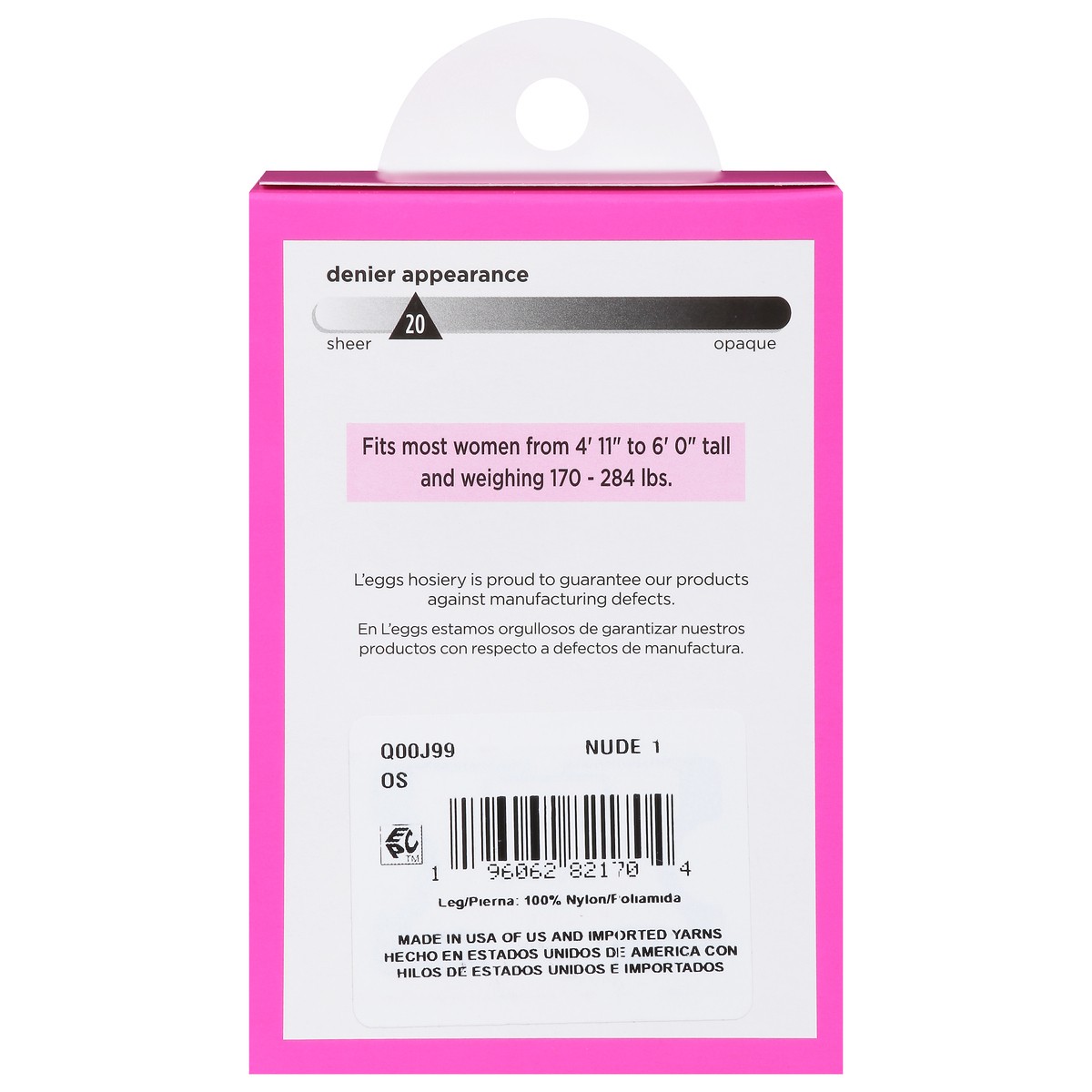One size. Nude. Sheer toe. Denier Appearance: 20 sheer. Fits most women from 4 feet 11 inch to 6 feet 0 inch tall and weighing 170 - 284 lbs. Enjoy the classic fit of L'eggs hosiery - every day! Your …