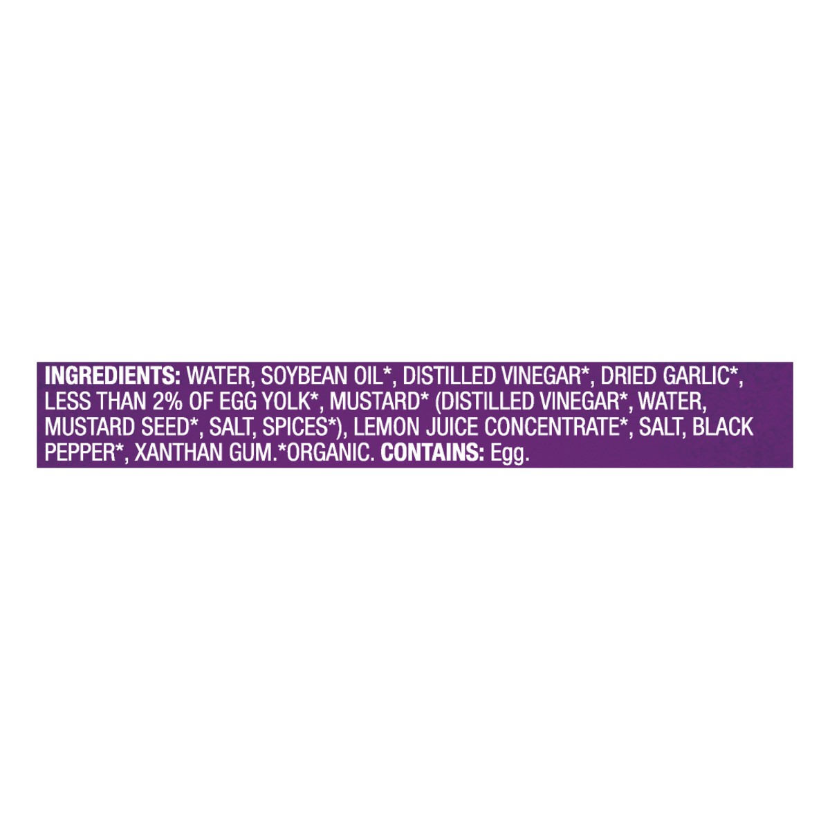 Water, Soybean Oil (Organic), Distilled Vinegar (Organic), Dried Garlic (Organic), Less than 2% of Egg Yolk (Organic), Mustard (Organic) (Distilled Vinegar (Organic), Water, Mustard Seed (Organic), Sa…
