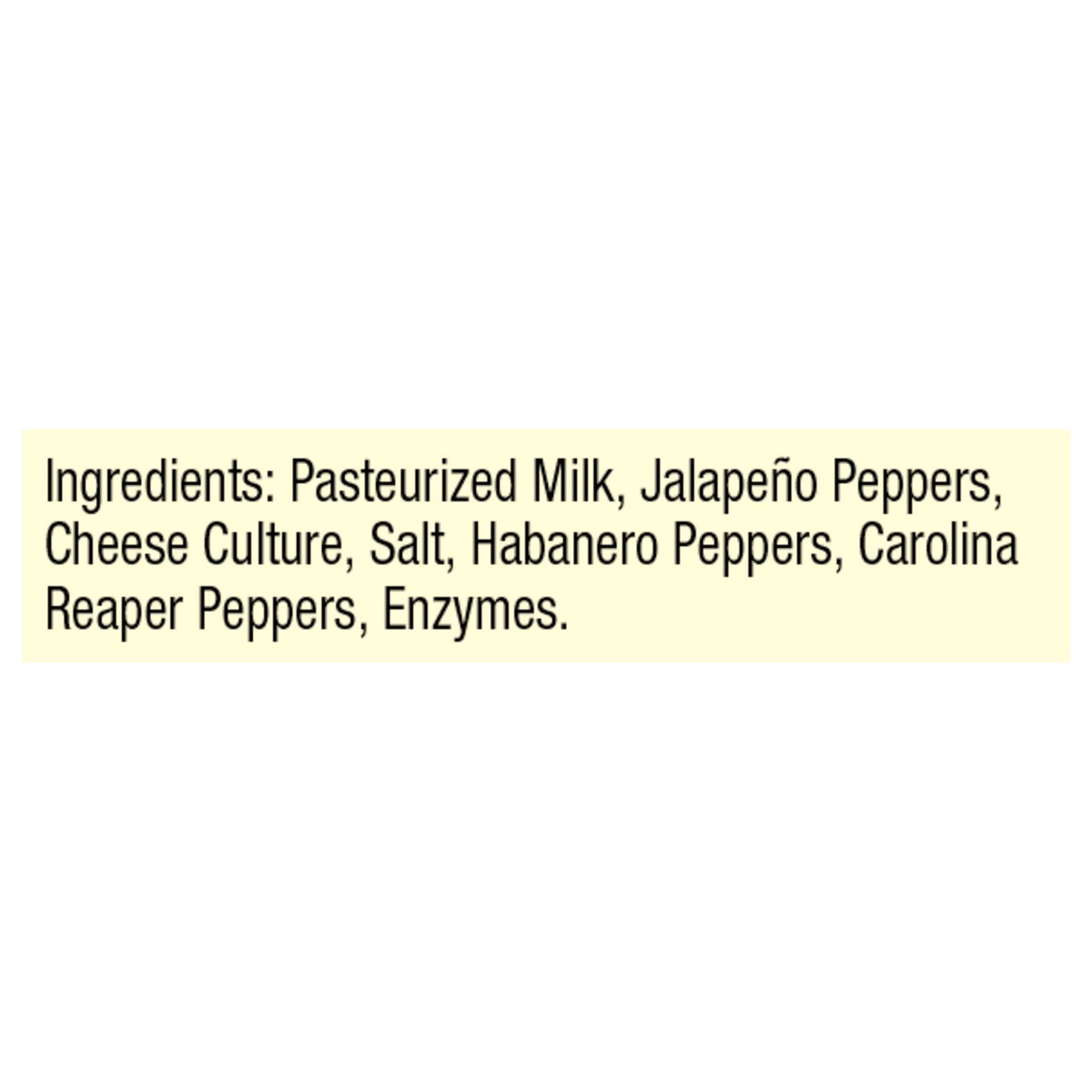 Pasteurized Milk, Jalapeno Peppers, Cheese Culture, Salt, Habanero Peppers, Carolina Reaper Peppers, Enzymes.