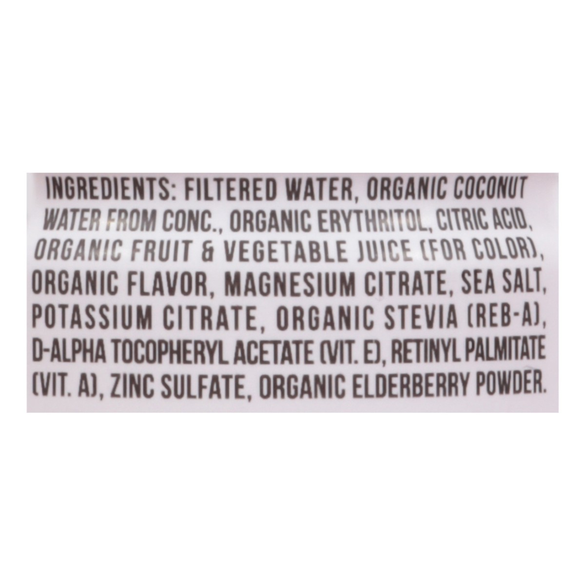 Filtered Water, Organic Coconut Water from Conc., Organic Erythritol, Citric Acid, Organic Fruit & Vegetable Juice (for Color), Organic Flavor, Magnesium Citrate, Sea Salt, Potassium Citrate, Organic …