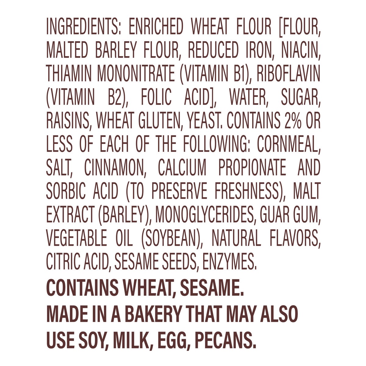 Enriched Wheat Flour [Flour, Malted Barley Flour, Reduced Iron, Niacin, Thiamin Mononitrate (Vitamin B1), Riboflavin (Vitamin B2), Folic Acid], Water, Sugar, Raisins, Wheat Gluten, Yeast, Contains 2% …