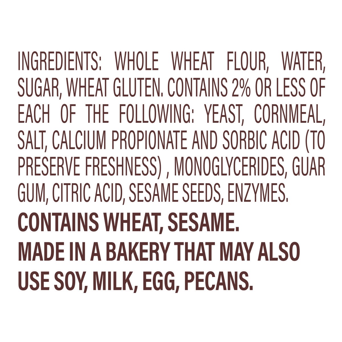 Whole Wheat Flour, Water, Sugar, Wheat Gluten, Contains 2% or Less of Each of the Following: Yeast, Cornmeal Salt, Calcium Propionate and Sorbic Acid (to Preserve Freshness), Monoglycerides, Guar Gum,…