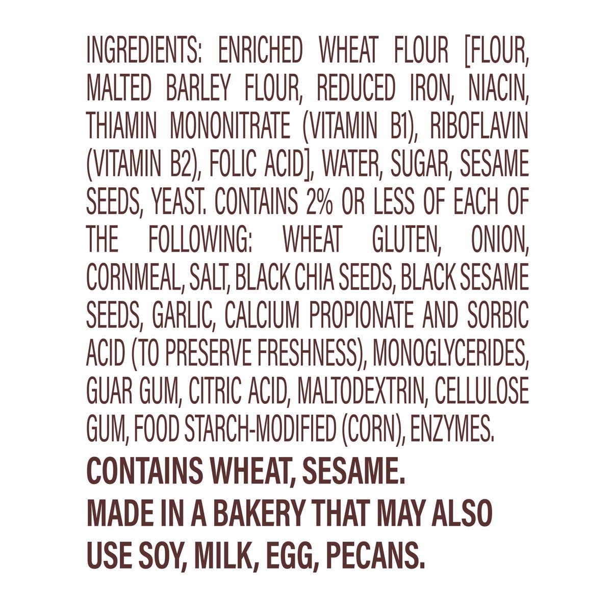Enriched Wheat Flour [Flour, Malted Barley Flour, Reduced Iron, Niacin, Thiamin Mononitrate (Vitamin B1), Riboflavin (Vitamin B2), Folic Acid], Water, Sugar, Sesame Seeds, Yeast, Contains 2% or Less o…