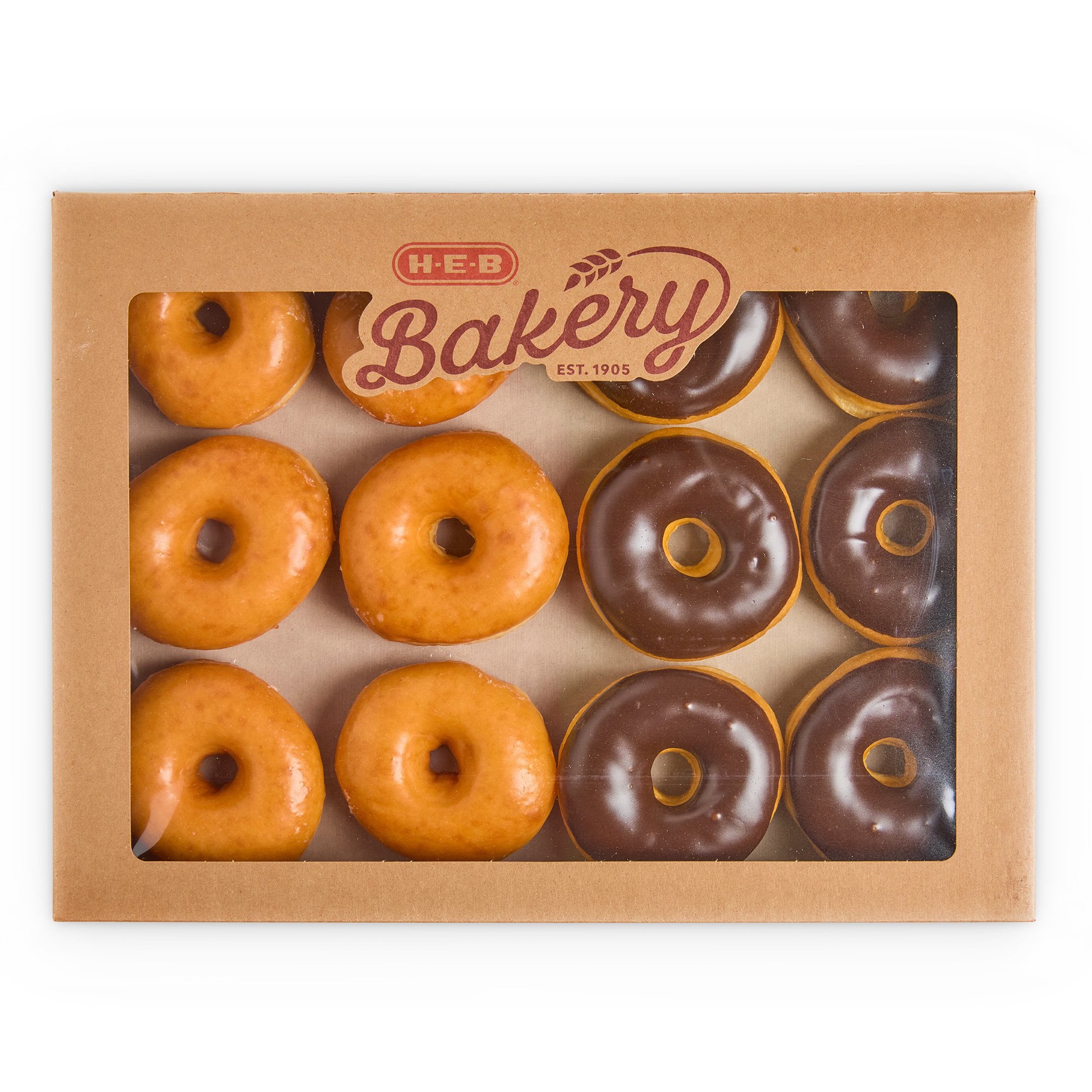 Start your day with a scrumptious donut from our H-E-B Bakery. This box of 12 yeast donuts (6 glazed and 6 chocolate iced) is great to take along with you to work, school or wherever you're headed for…