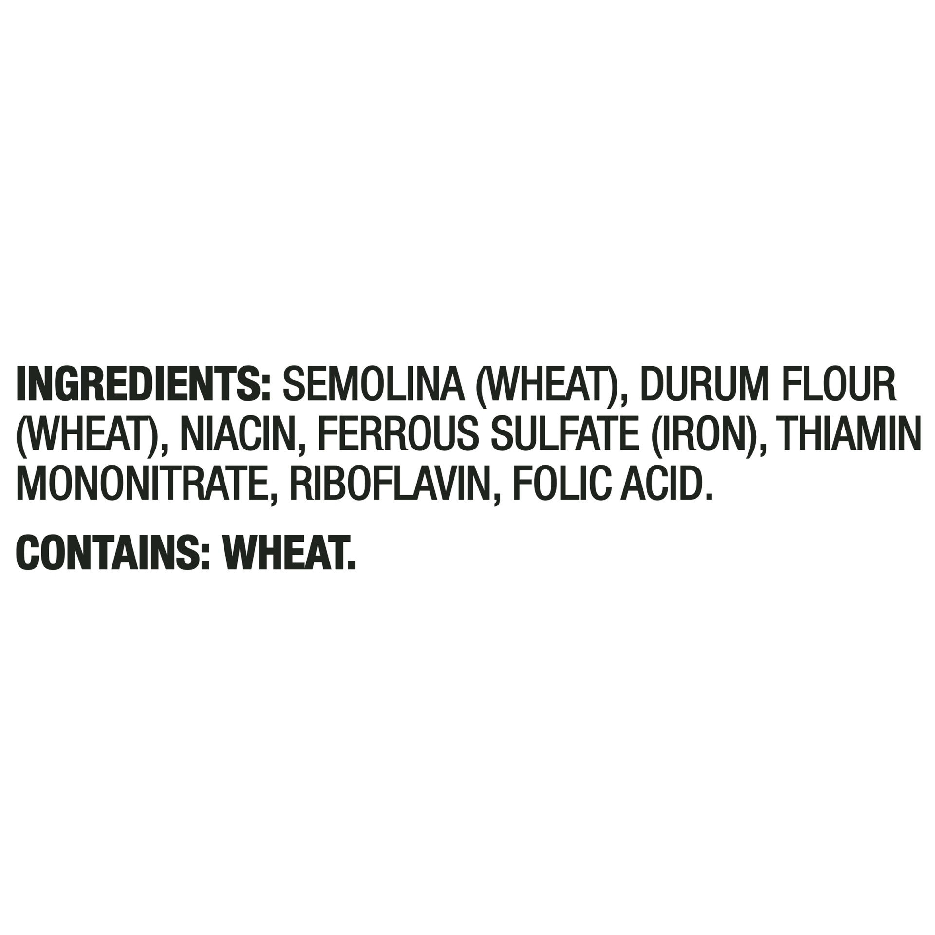 Semolina (Wheat), Durum Flour (Wheat), Niacin, Iron (Ferrous Sulfate), Thiamin Mononitrate, Riboflavin, Folic Acid.