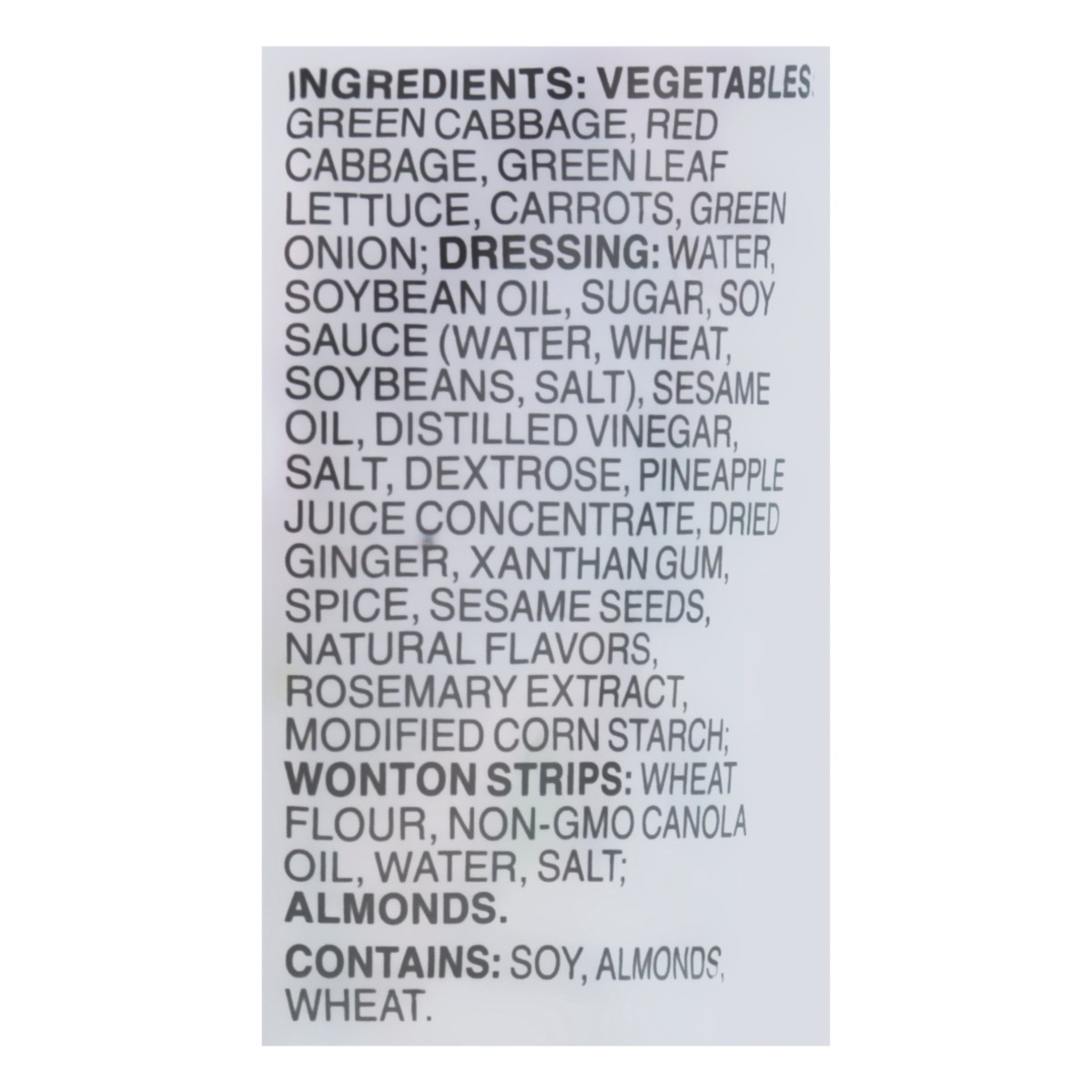 Vegetables: Green Cabbage, Red Cabbage, Green Leaf Lettuce, Carrots, Green Onion; Dressing: Water, Soybean Oil, Sugar, Soy Sauce (Water, Wheat, Soybeans, Salt), Sesame Oil, Distilled Vinegar, Salt, De…