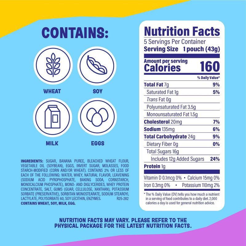 Sugar, Banana Puree, Bleached Wheat Flour, Vegetable Oil (Soybean), Eggs, Invert Sugar, Molasses, Food Starch-Modified (Corn and/or Wheat), Contains 2% or Less of Each of the Following: Water, Whey, N…