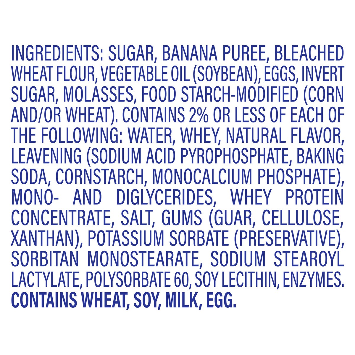 Sugar, Banana Puree, Bleached Wheat Flour, Vegetable Oil (Soybean), Eggs, Invert Sugar, Molasses, Food Starch-Modified (Corn and/or Wheat). Contains 2% or Less of Each of the Following: Water, Whey, N…