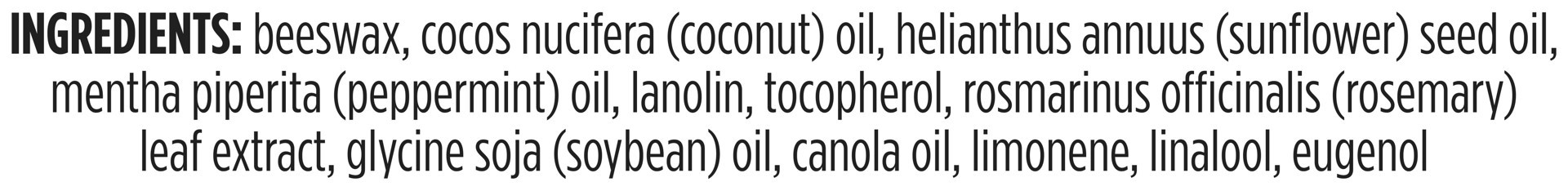 Beeswax, Cocos Nucifera (Coconut) Oil, Helianthus Annuus (Sunflower) Seed Oil, Mentha Piperita (Peppermint) Oil, Lanolin, Tocopherol, Rosmarinus Officinalis (Rosemary) Leaf Extract, Glycine Soja (Soyb…