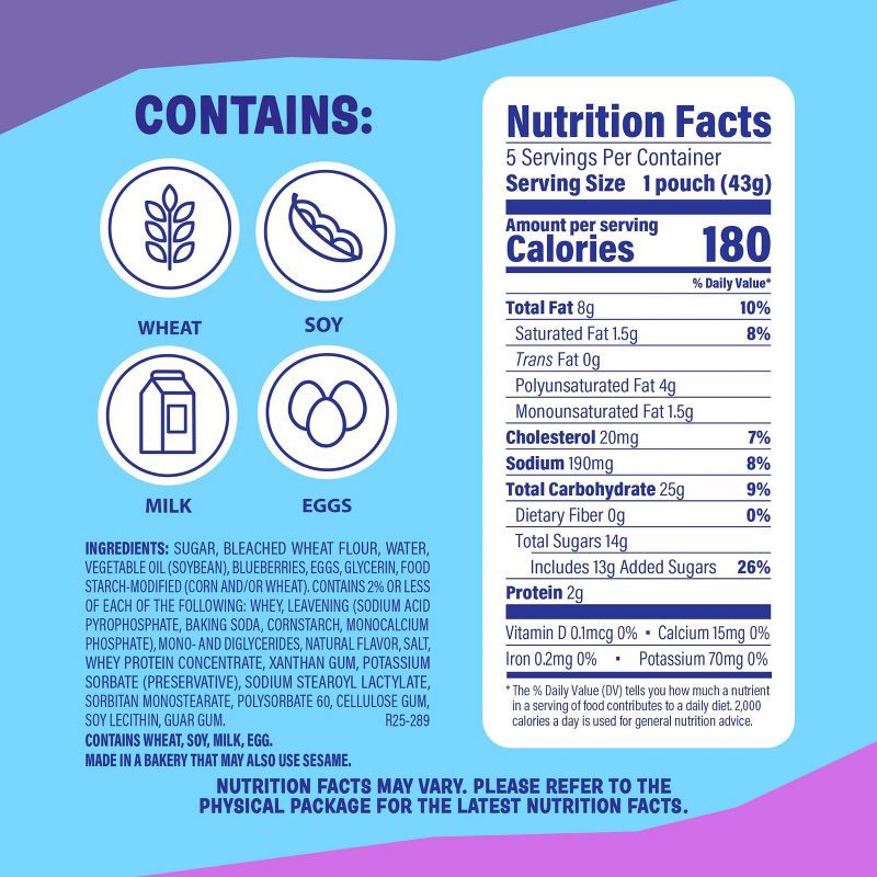 Sugar, Bleached Wheat Flour, Water, Vegetable Oil (Soybean), Blueberries, Eggs, Glycerin, Food Starch-Modified (Corn and/or Wheat), Contains 2% or Less of Each of the Following: Whey, Leavening (Sodiu…