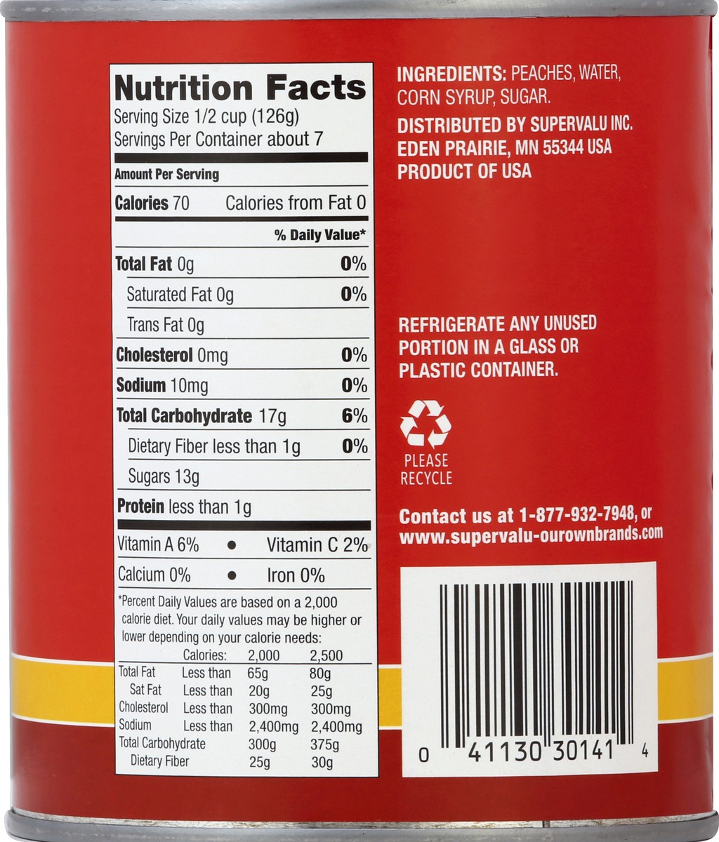 Per 1/2 Cup: 70 calories; 0 g sat fat (0% DV); 10 mg sodium (0% DV); 13 g sugars. Contact us at 1-877-932-7948, or www.supervalu-ourownbrands.com. Please recycle. Product of USA.