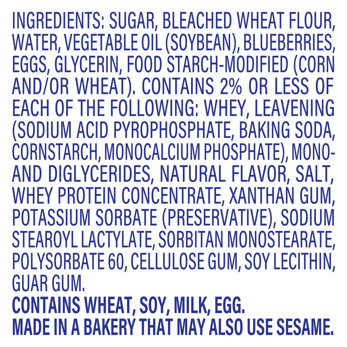 Sugar, Bleached Wheat Flour, Water, Vegetable Oil (Soybean), Blueberries, Eggs, Glycerin, Food Starch-Modified (Corn and/or Wheat), Contains 2% or Less of Each of the Following: Whey, Leavening (Sodiu…