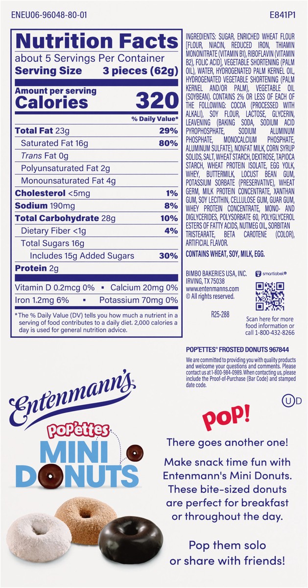 Indulge your sweet cravings with Entenmann's Pop'ettes Frosted Mini Donuts, 12 oz, Mini Donuts, Box. These delightful treats bring together the rich taste of Rich Frosted donuts with the convenience o…