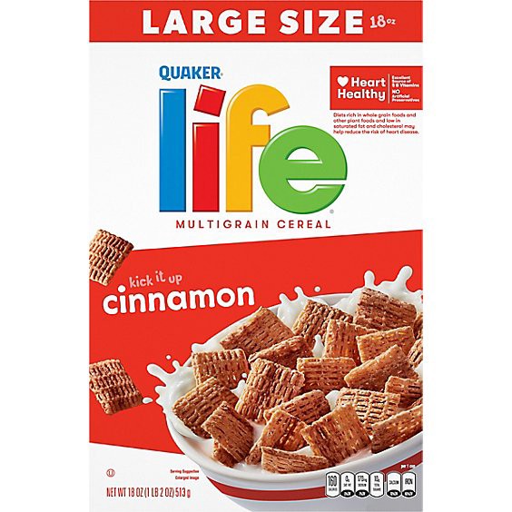 LIFE Cinnamon Multigrain Cereal offers a wholesome breakfast treat with just the right touch of sweetness and a lively touch of cinnamon. Each square is made with whole grain oats, whole wheat, and ot…