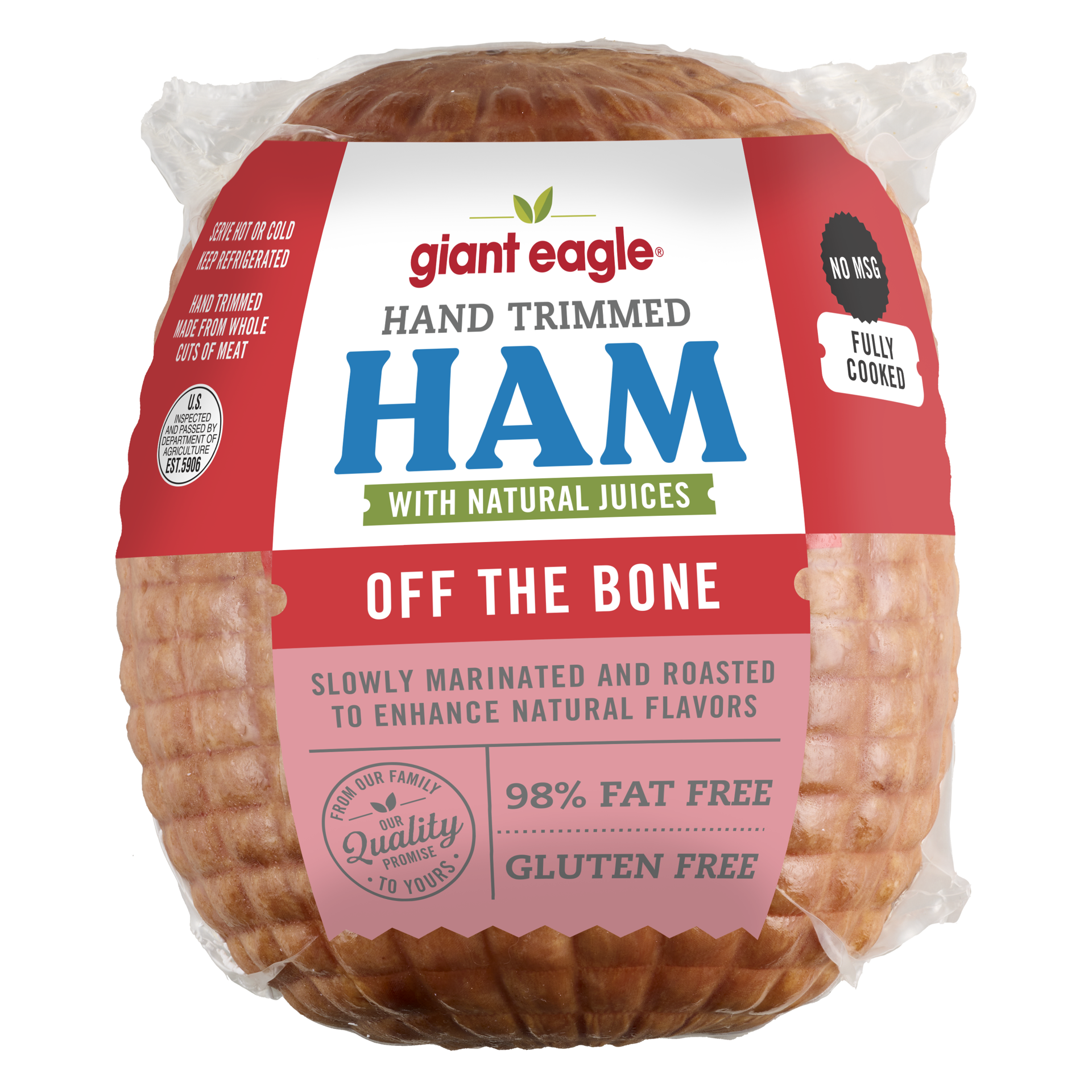 US Inspected Hand Trimmed Ham With Natural Juices, Off The Bone. Slowly Marinated And Roasted To Enhance Natural Flavors. Fat Free and Also Gluten Free.