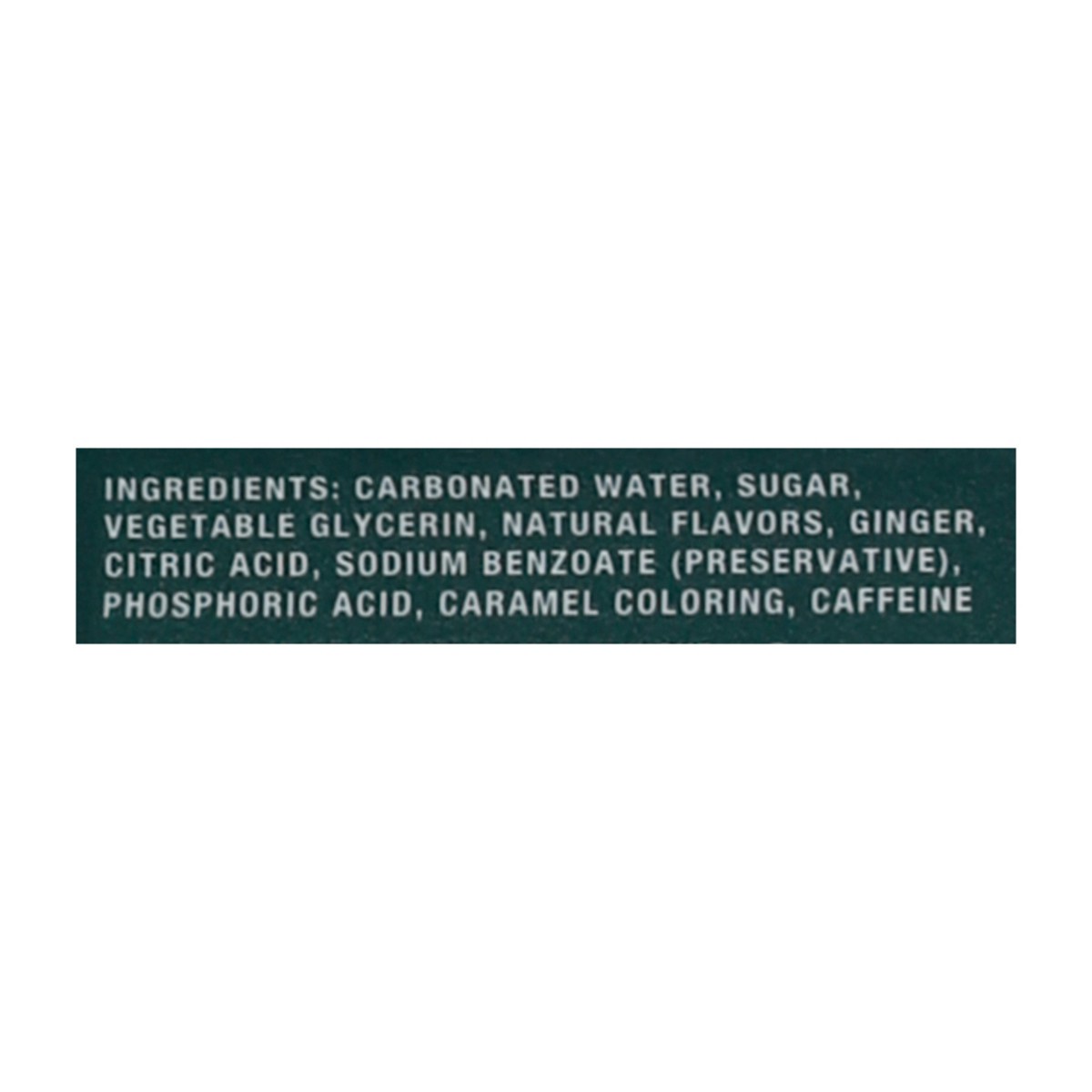 Carbonated Water, Sugar, Vegetable Glycerin, Natural Flavors, Ginger, Citric Acid, Sodium Benzoate (Preservative), Phosphoric Acid, Caramel Coloring, Caffeine.