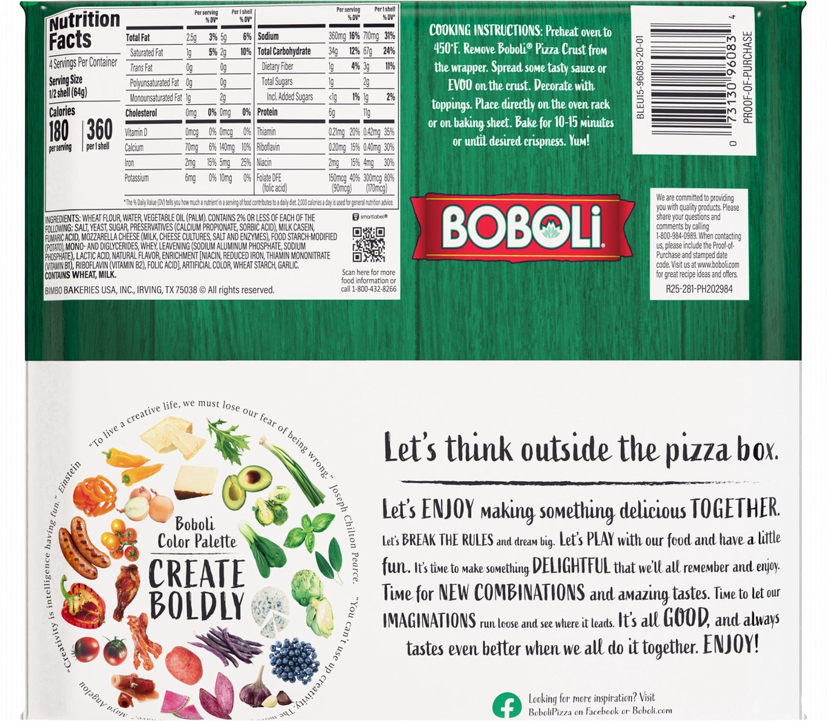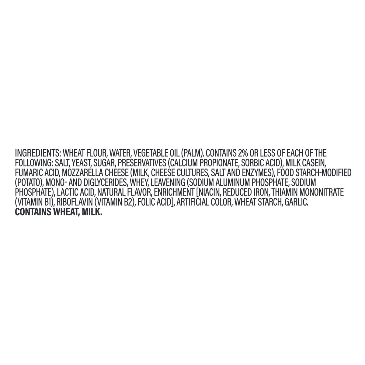 Wheat Flour, Water, Vegetable Oil (Palm). Contains 2% or Less of Each of the Following: Salt, Yeast, Sugar, Preservatives (Calcium Propionate, Sorbic Acid), Milk Casein, Fumaric Acid, Mozzarella Chees…