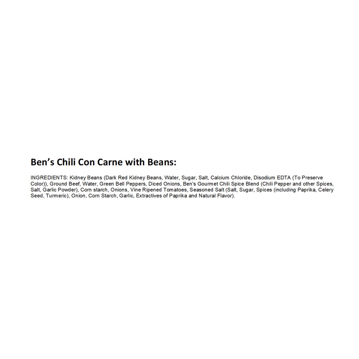 Kidney Beans (Dark Red Kidney Beans, Water, Sugar, Salt, Calcium Chloride, Disodium EDTA (to Preserve Color)), Ground Beef, Water, Green Bell Peppers, Diced Onions, Ben's Gourmet Chili Spice Blend (Ch…