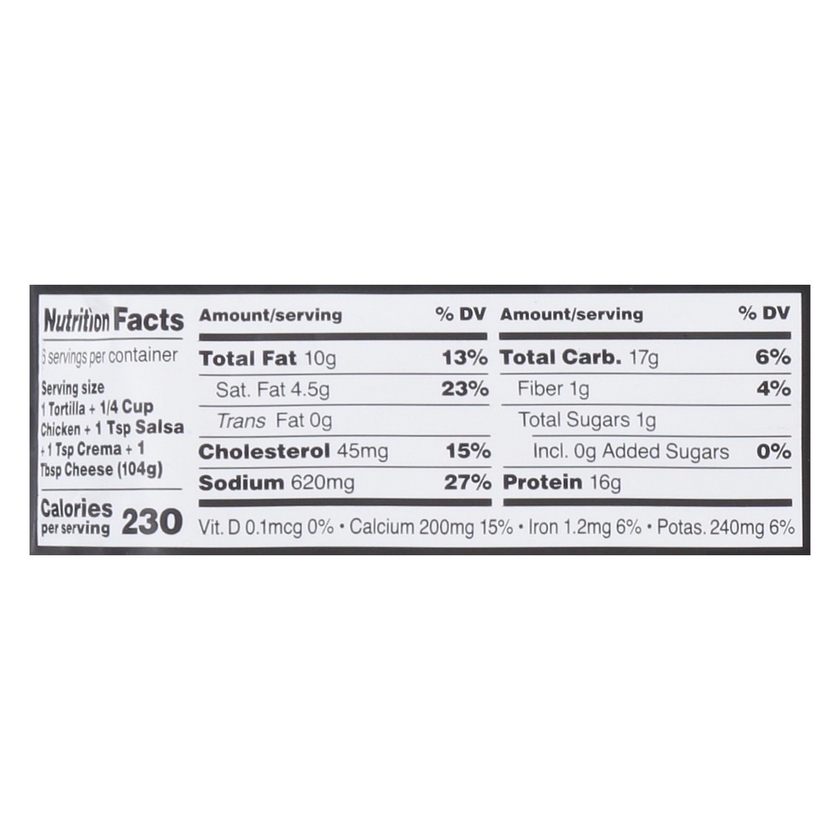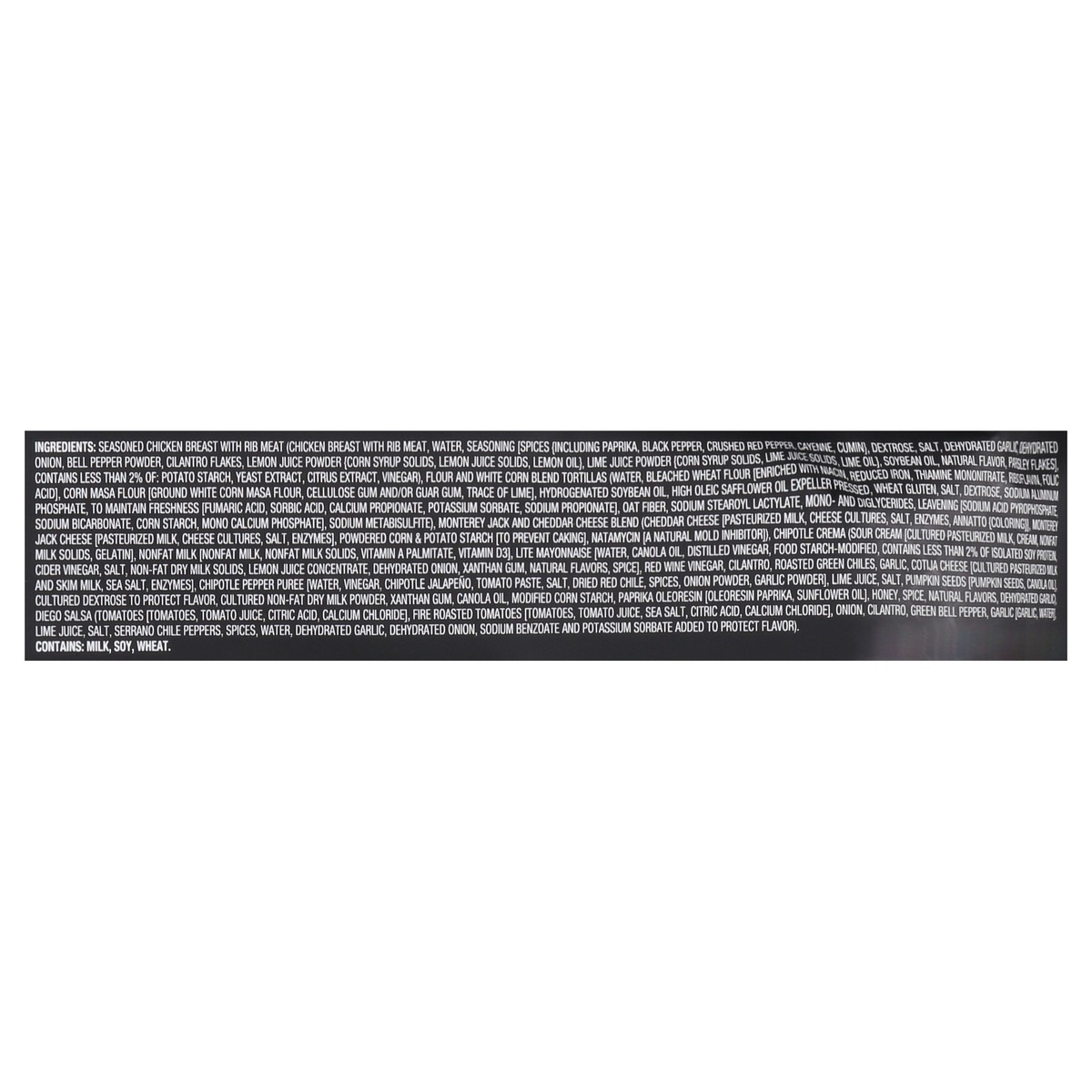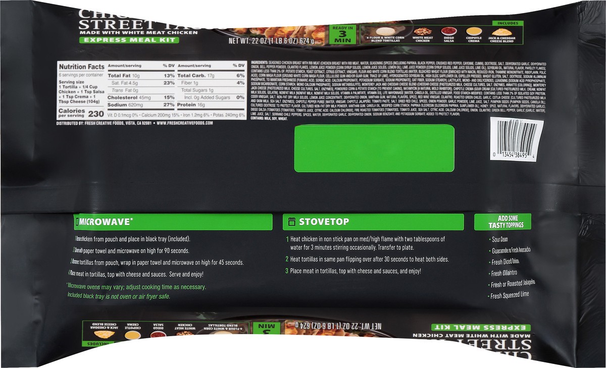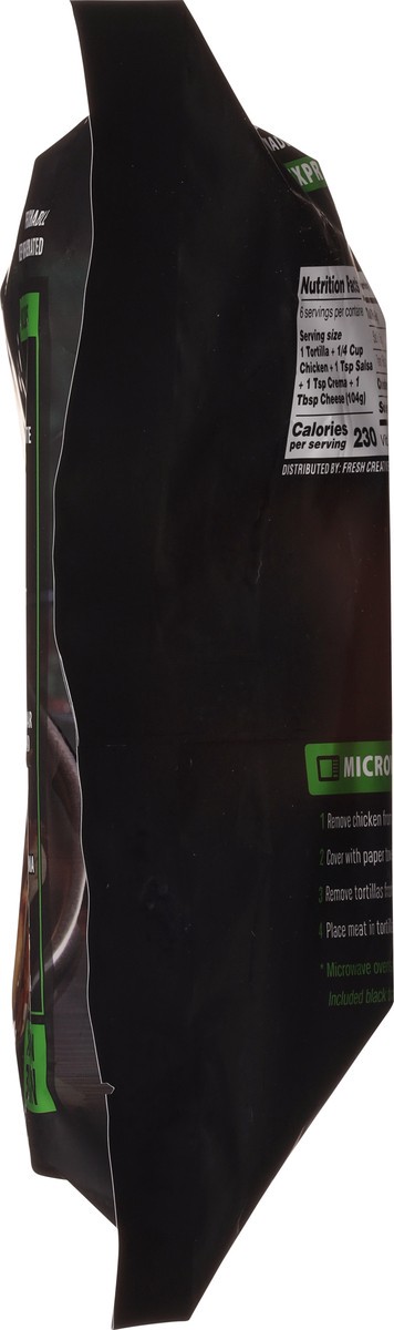 Includes: 6 Flour & White Corn Blend Tortillas; White Meat Chicken; Jack & Cheddar Cheese Blend; Chipotle Crema; Diego Salsa. Makes 6 tacos. Ready in 3 mins. www.freshcreativefoods.com.