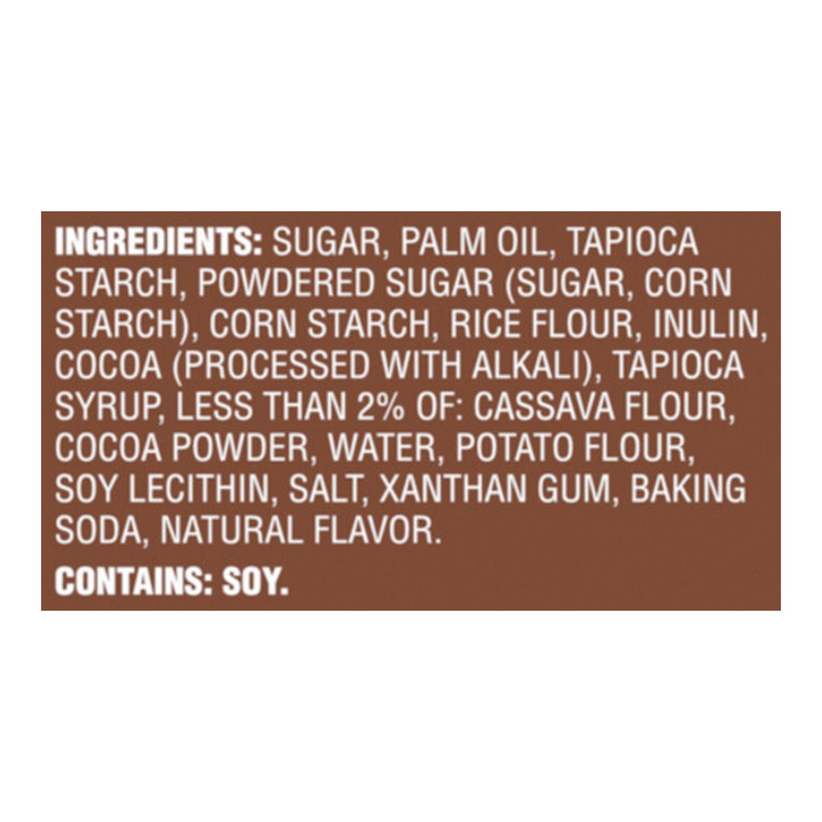 Sugar, Palm Oil, Tapioca Starch, Powdered Sugar (Sugar, Corn Starch), Corn Starch, Rice Flour, Inulin, Cocoa (Processed with Alkali), Tapioca Syrup, Less than 2% of: Cassava Flour, Cocoa Powder, Water…
