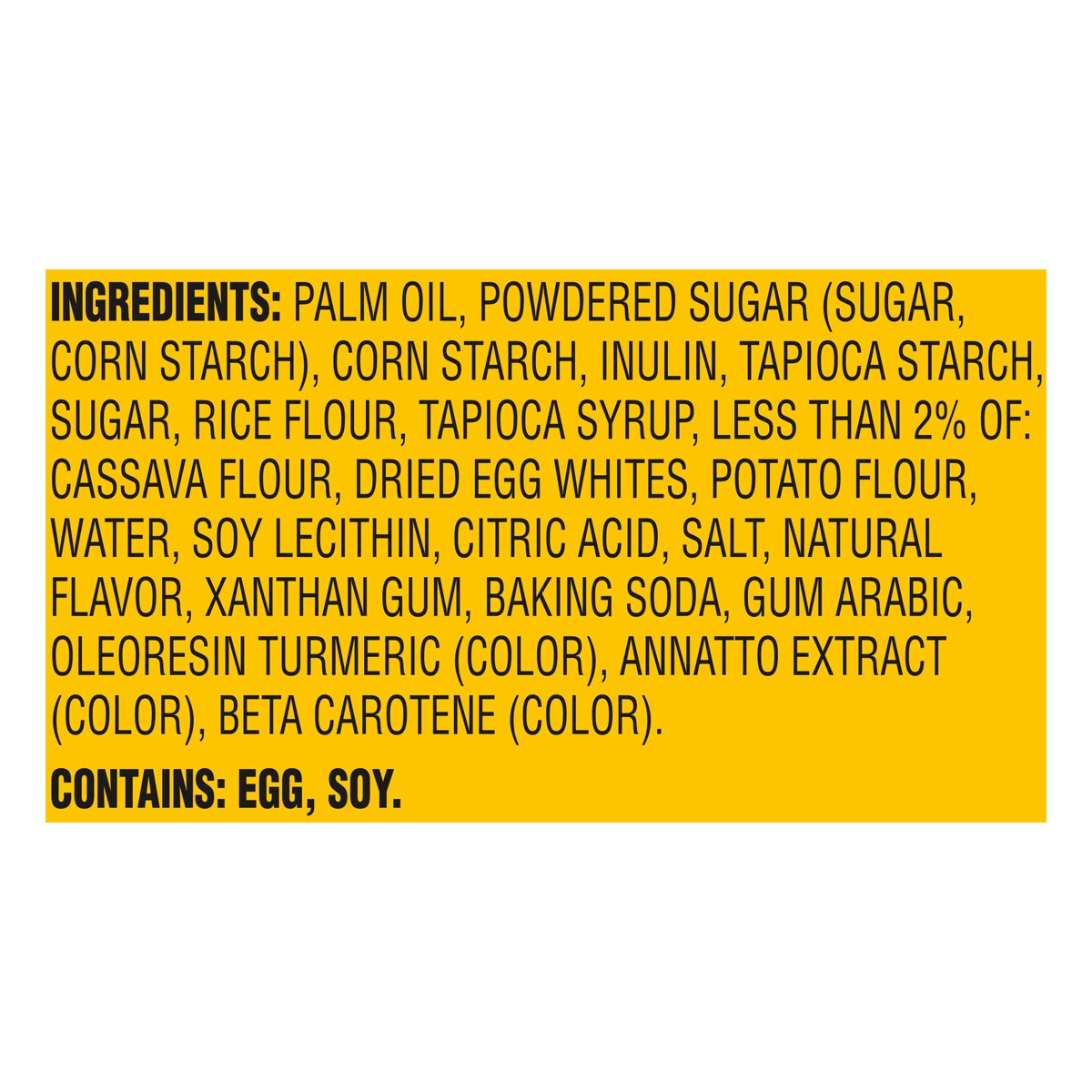 Palm Oil, Powdered Sugar (Sugar, Corn Starch), Corn Starch, Inulin, Tapioca Starch, Sugar, Rice Flour, Tapioca Syrup, Less than 2% of: Cassava Flour, Dried Egg Whites, Potato Flour, Water, Soy Lecithi…