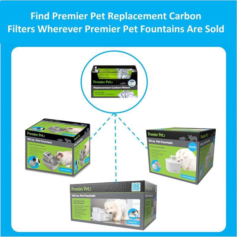 The Premier Pet™ Replacement Carbon Filters remove bad tastes and odors, providing fresh, filtered water for your pet. To ensure the freshest water and a long-lasting fountain, it is recommended to re…