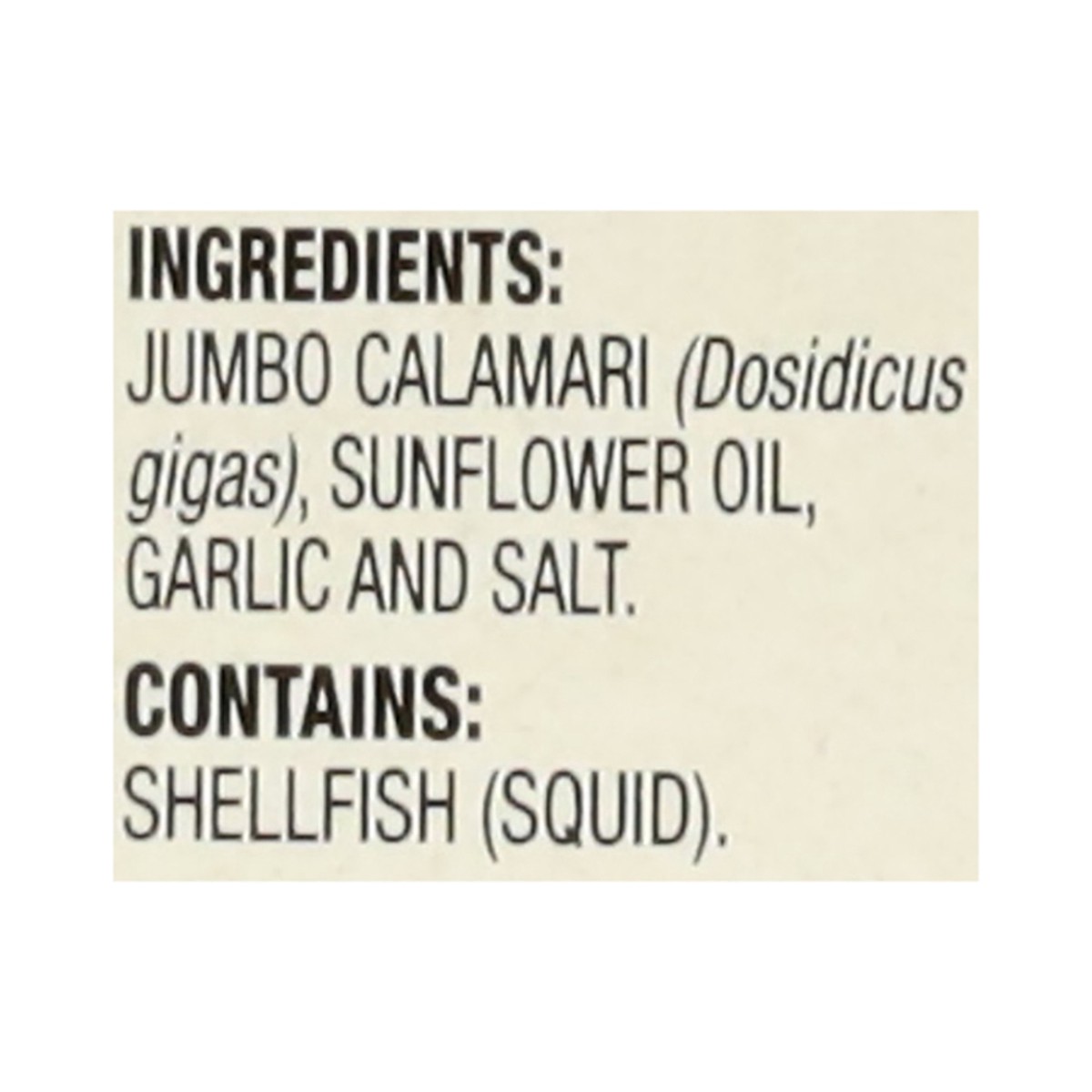 Jumbo Calamari (Dosidicus Gigas), Sunflower Oil, Garlic and Salt.