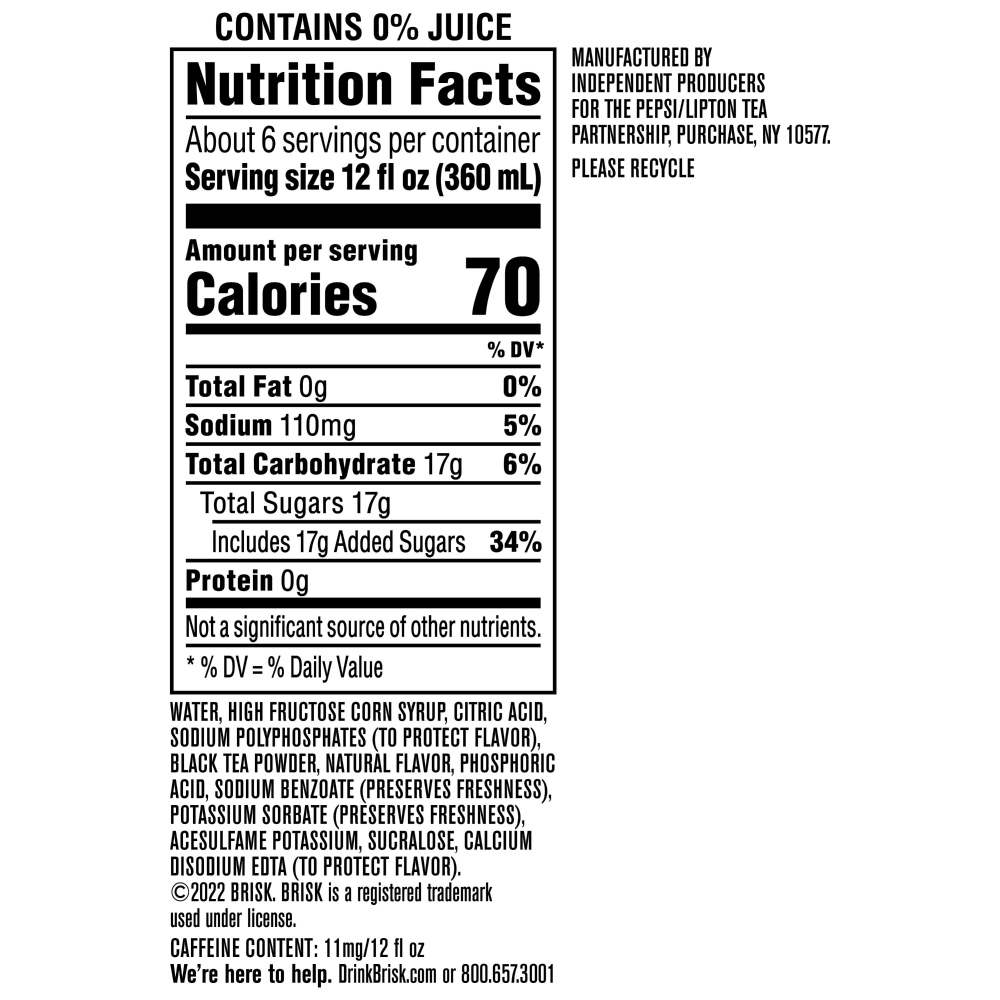 Water, High Fructose Corn Syrup, Citric Acid, Sodium Polyphosphates (to Protect Flavor), Black Tea Powder, Natural Flavor, Phosphoric Acid, Sodium Benzoate (Preserves Freshness), Potassium Sorbate (Pr…