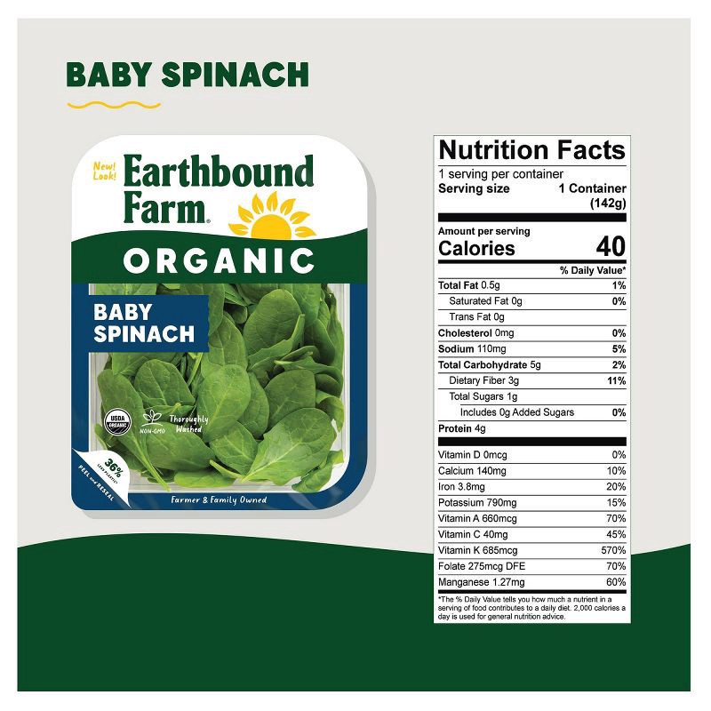 Savor the taste of Earthbound Farm's Organic Baby Spinach, harvested with care for optimum freshness and flavor. This nutrient-rich, versatile green is perfect for salads, smoothies, omelets, or any o…