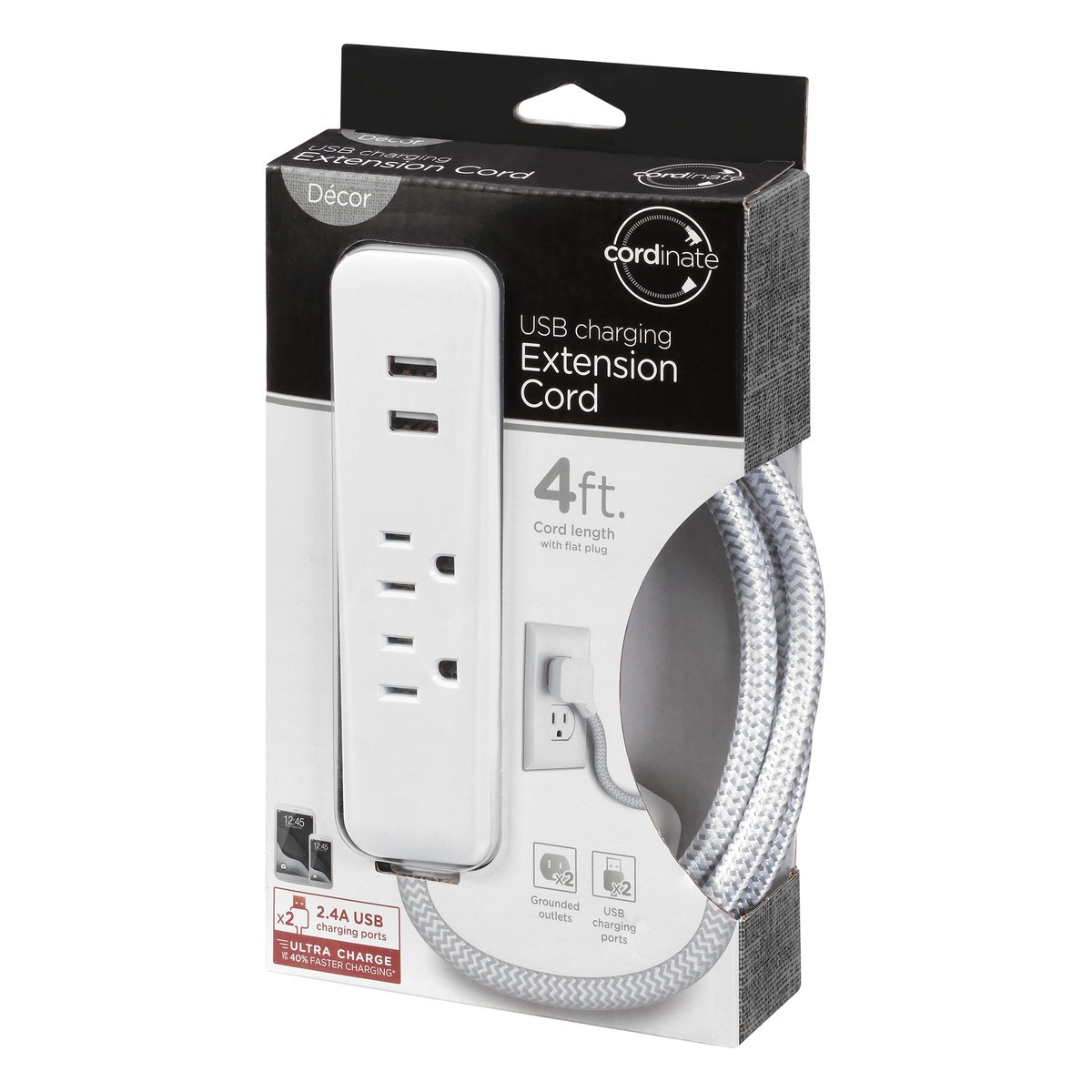 Cordinate. Cord length with flat plug. x2 2.4A USB charging ports. Ultra charge 40% faster charging (Result may vary by device). x2 grounded outlets. x2 USB charging ports. 4ft. cord with flat plug. 2…