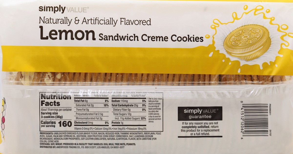Naturally & artificially flavored. Per 3 Cookie Serving: 160 calories; 2 g sat fat (10% DV); 110 mg sodium (5% DV); 12 g total sugars. Simply Value Guarantee: If for any reason you are not completely …