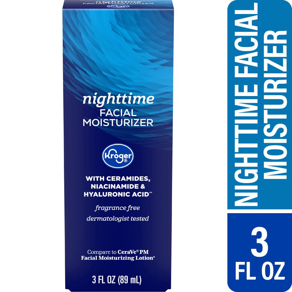 Kroger® Nighttime Facial Moisturizer dives deep into skin overnight for great hydration. This moisturizer helps restore your skin's moisture barrier, and the hyaluronic acid helps smooth the appearanc…