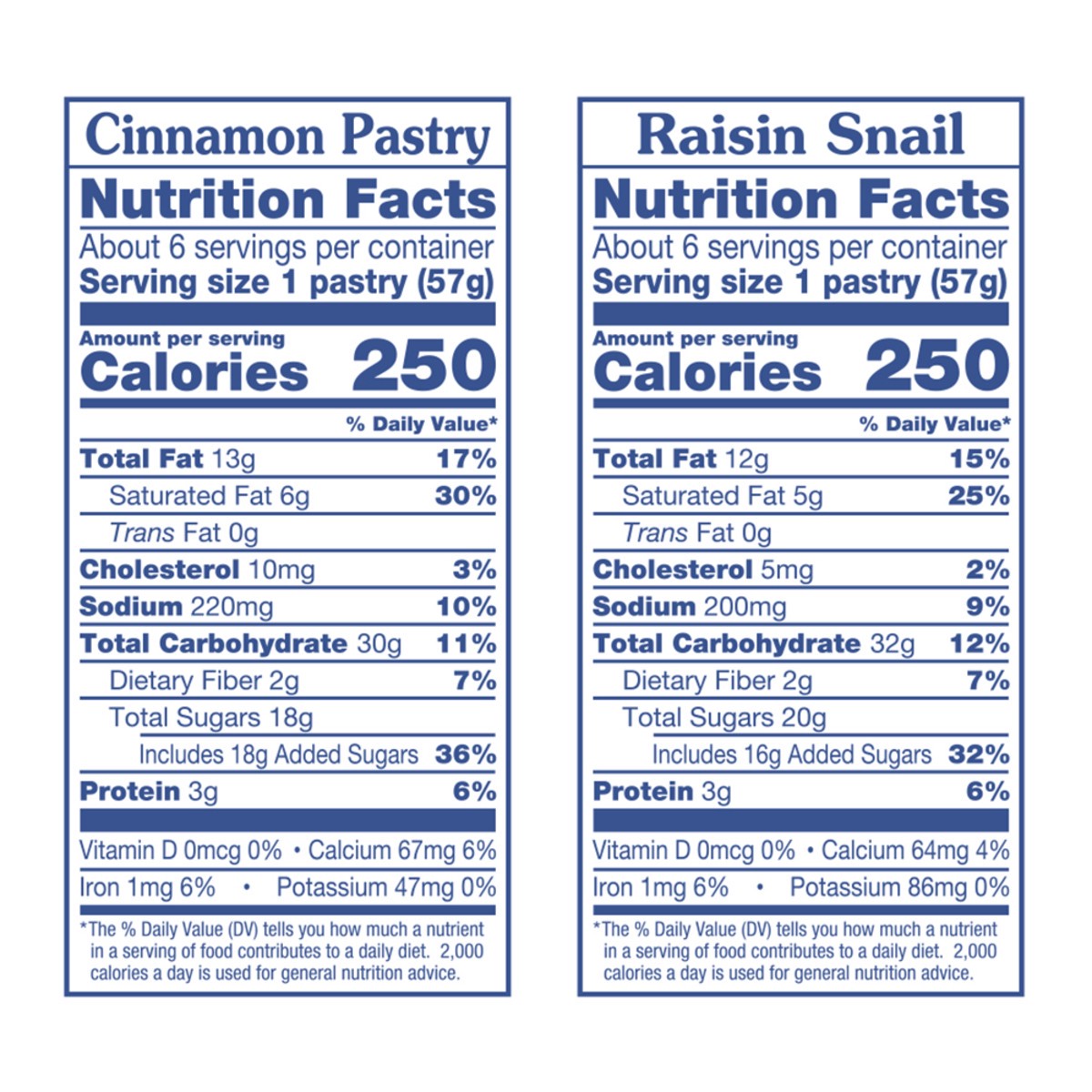 Raisin Snail: Danish Mix (Enriched Wheat Flour [Wheat Flour, Niacin, Iron, Thiamine Mononitrate, Riboflavin, Folic Acid], Sugar, Dextrose, Palm Oil, Soybean Oil, Nonfat Milk, Mono- and Diglycerides, C…