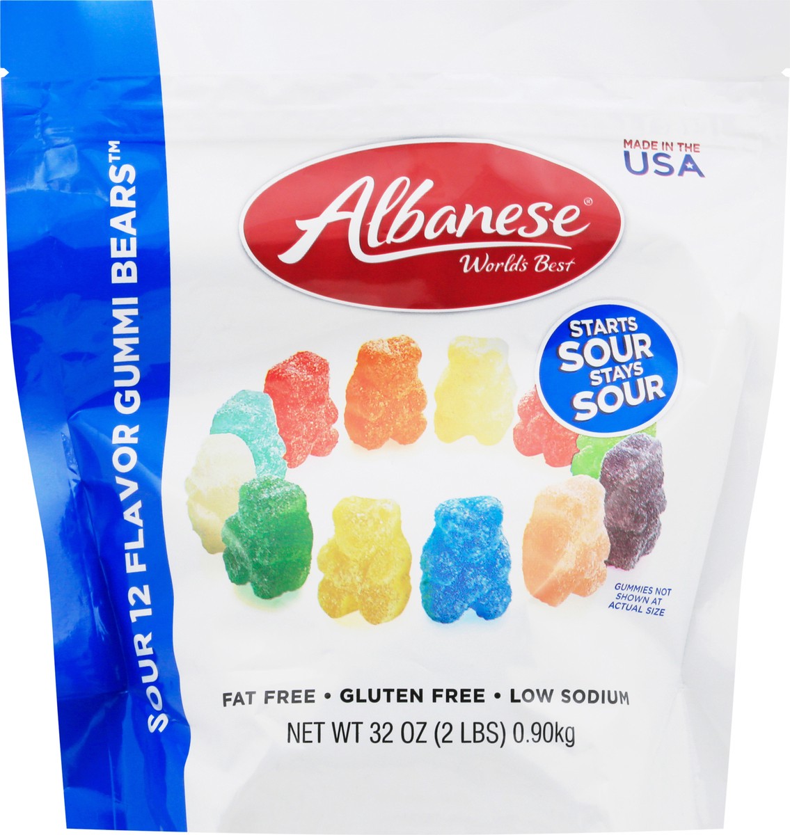 Sour 12 Flavor Gummi Bears: Cherry, Strawberry, Mango, Pineapple, Lemon, Orange, Green Apple, Watermelon, Pink Grapefruit, Lime, Blue Raspberry, Grape. Fat free. Gluten free. Low sodium. Starts sour. …