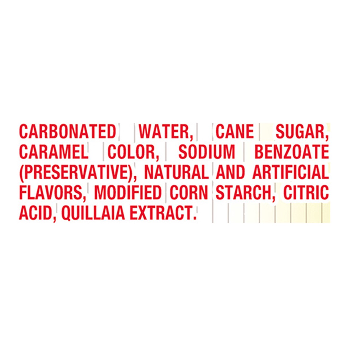 Carbonated Water, Cane Sugar, Caramel Color, Sodium Benzoate (Preservative), Natural and Artificial Flavors, Modified Corn Starch, Citric Acid, Quillaia Extract.