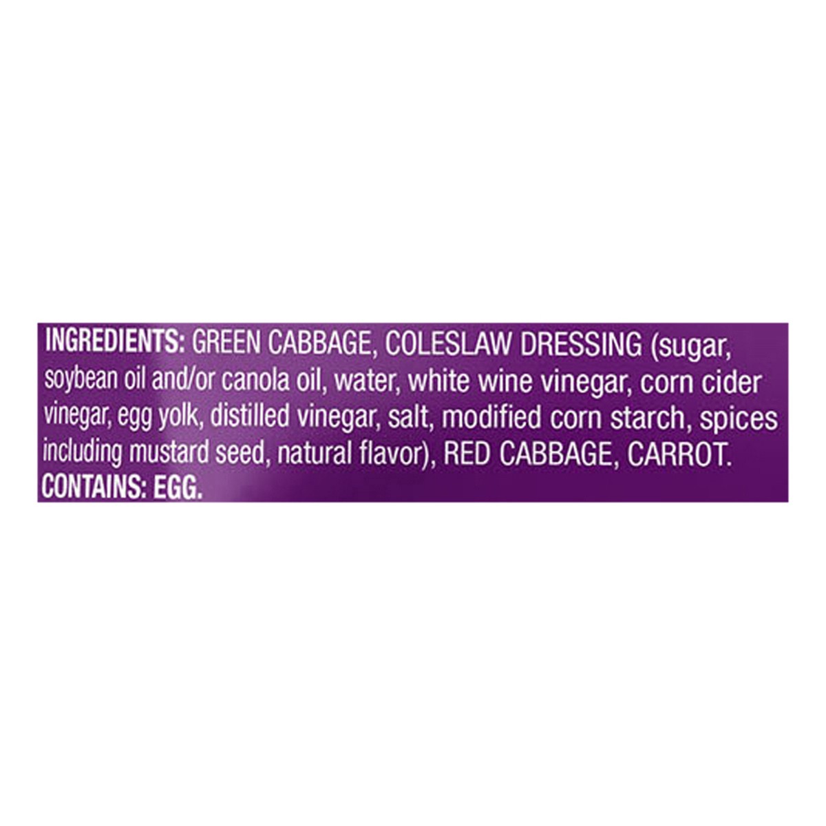Green Cabbage, Coleslaw Dressing (Sugar, Soybean Oil and/or Canola Oil, Water, White Wine Vinegar, Corn Cider Vinegar, Egg Yolk, Distilled Vinegar, Salt, Modified Corn Starch, Spices Including Mustard…