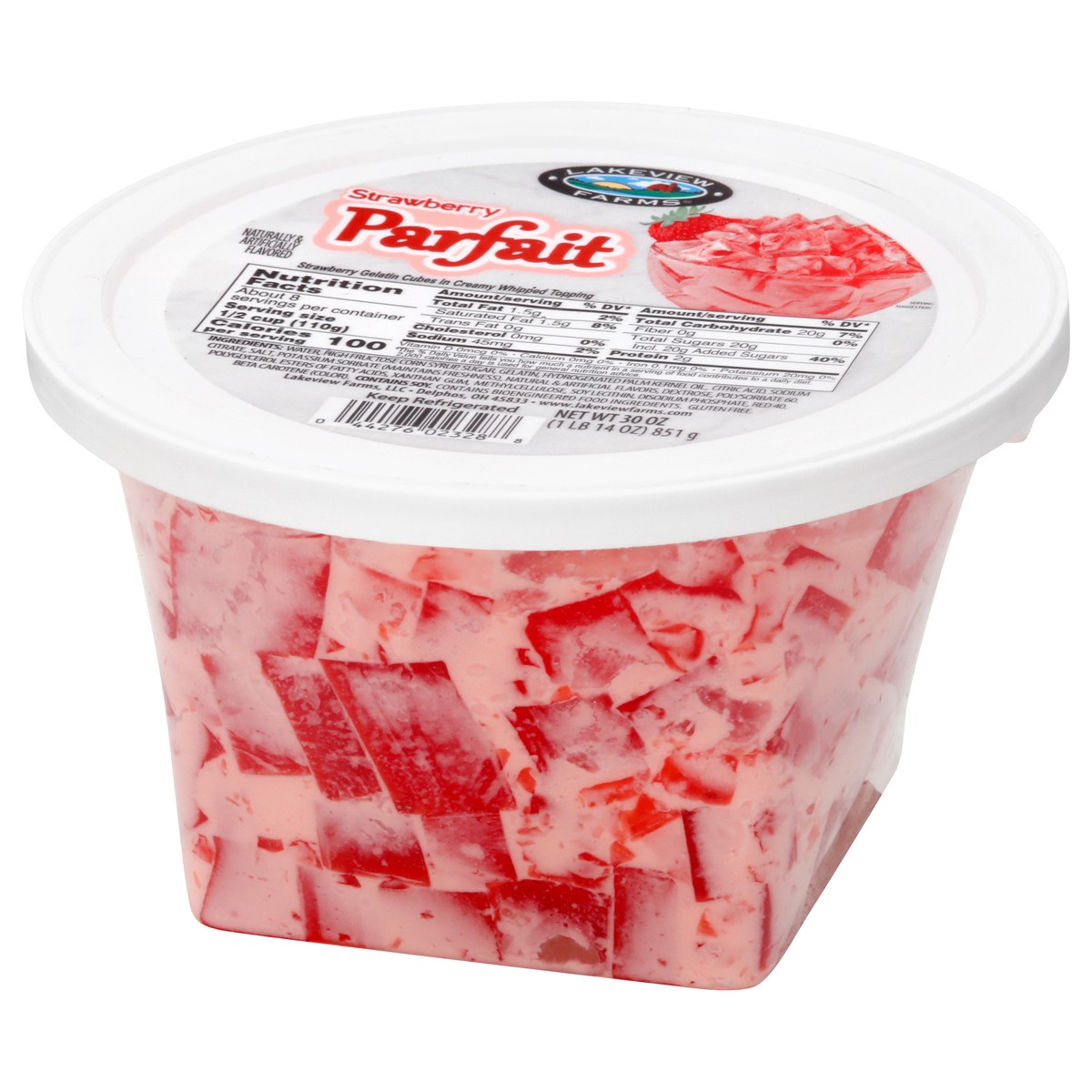 Strawberry gelatin cubes in creamy whipped topping. Natural & artificial flavored. Gluten free. Contains bioengineered food ingredients. www.lakeviewfarms.com.
