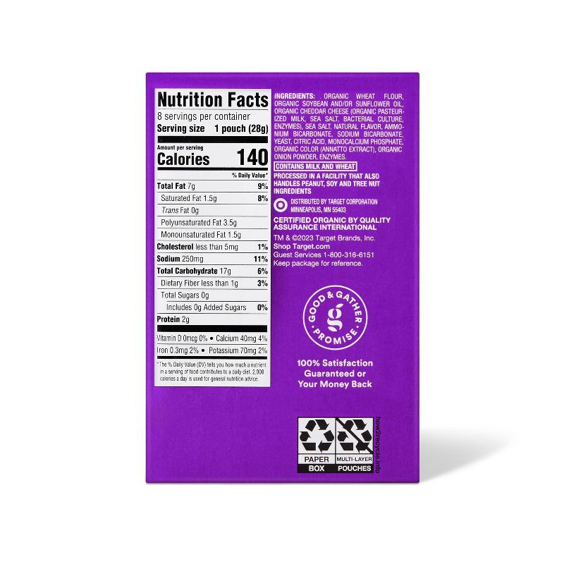 ORGANIC WHEAT FLOUR, ORGANIC SOYBEAN AND/OR SUNFLOWER OIL, ORGANIC CHEDDAR CHEESE (ORGANIC PASTEURIZED MILK, SEA SALT, BACTERIAL CULTURE, ENZYMES), SEA SALT, NATURAL FLAVOR, AMMONIUM BICARBONATE, SODI…