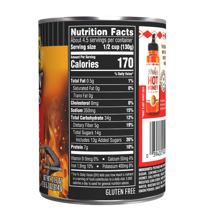 Prepared Navy Beans, Water, Brown Sugar. Contains 2% or Less of: Mike's Hot Honey (Honey, Chili Peppers, Vinegar), Honey, Salt, Vinegar, Modified Corn Starch, White Mustard (Vinegar, Water, Mustard Se…