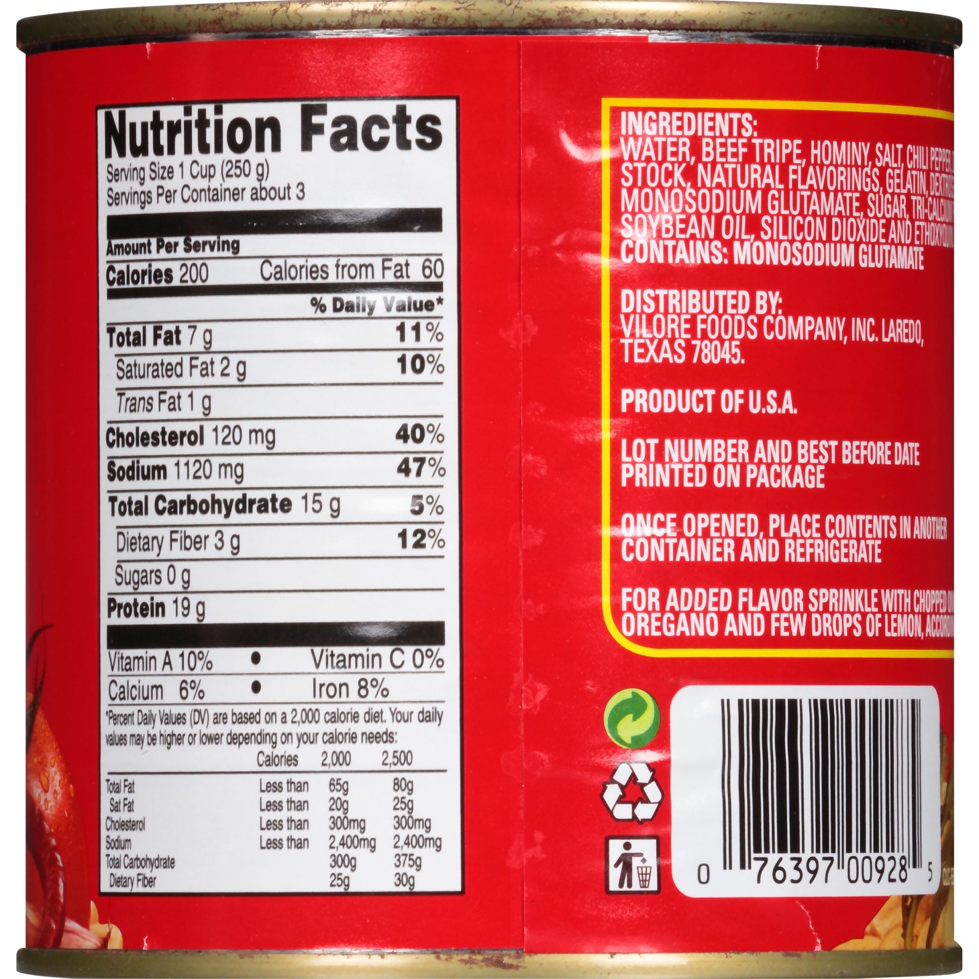 Water, Beef Tripe, Hominy, Salt, Chili Pepper, Dried Beef Stock, Natural Flavorings, Gelatin, Dextrose, Monosodium Glutamate, Sugar, Tri-Calcium Phosphate, Soybean Oil, Silicon Dioxide and Ethoxyquin.