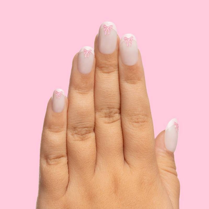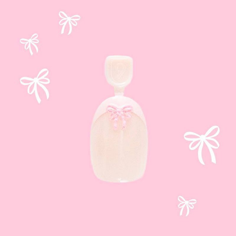 - A double pink mani dream with a pastel pink base and bright pink bows in a short/medium round shape.