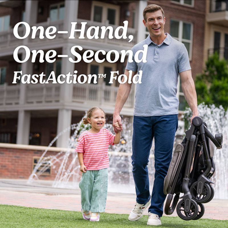 - The Graco signature FastAction Fold offers a one-second, one-hand fold for quick and easy storage and transportation