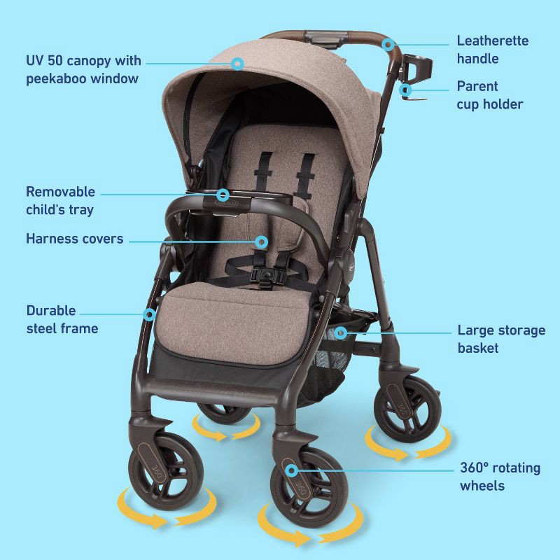 Features: Forward Facing Seat, Canopy, Folds for Easy Transport and Storage, Infant Car Seat Compatible