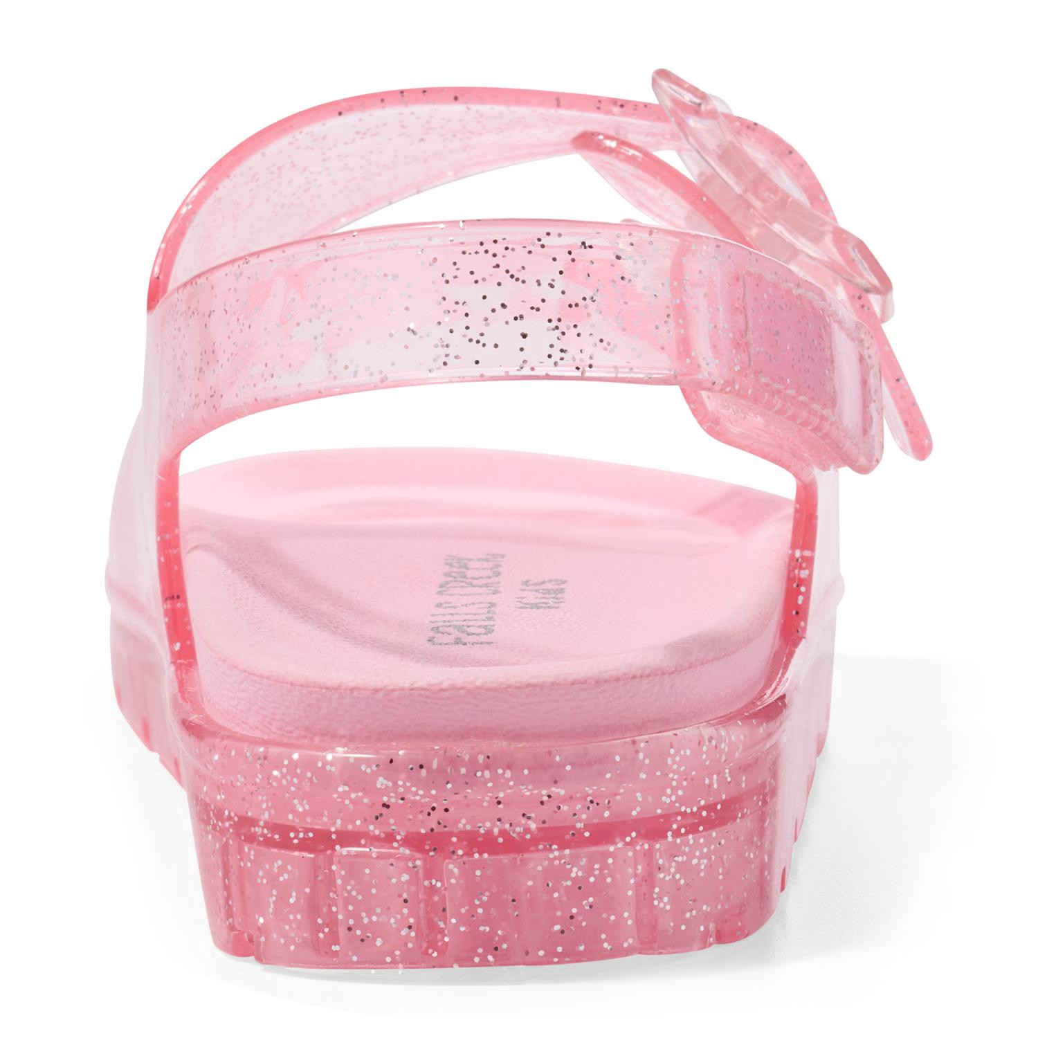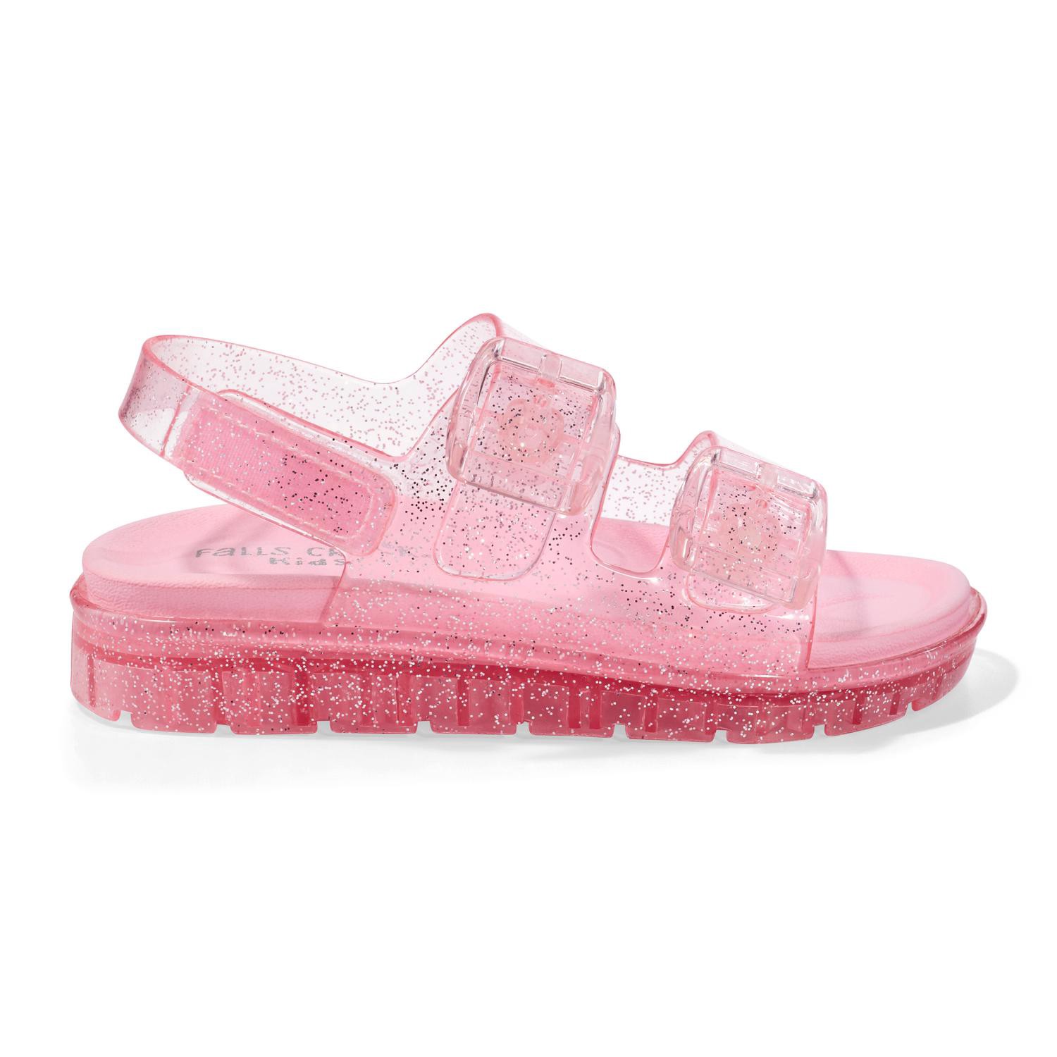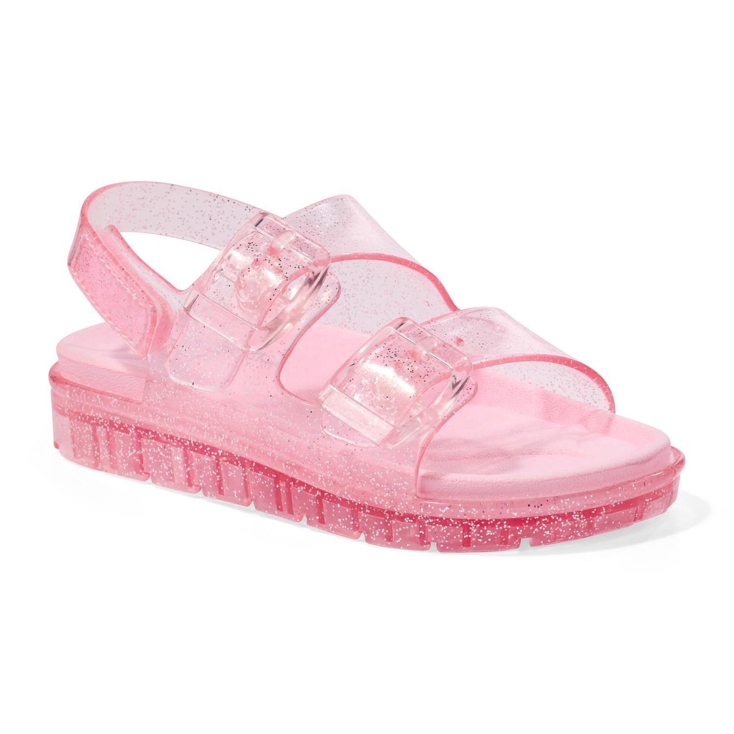 Translucent pink glitter jelly adjustable heel strap sandal gives her that pretty pop that goes with every outfit.