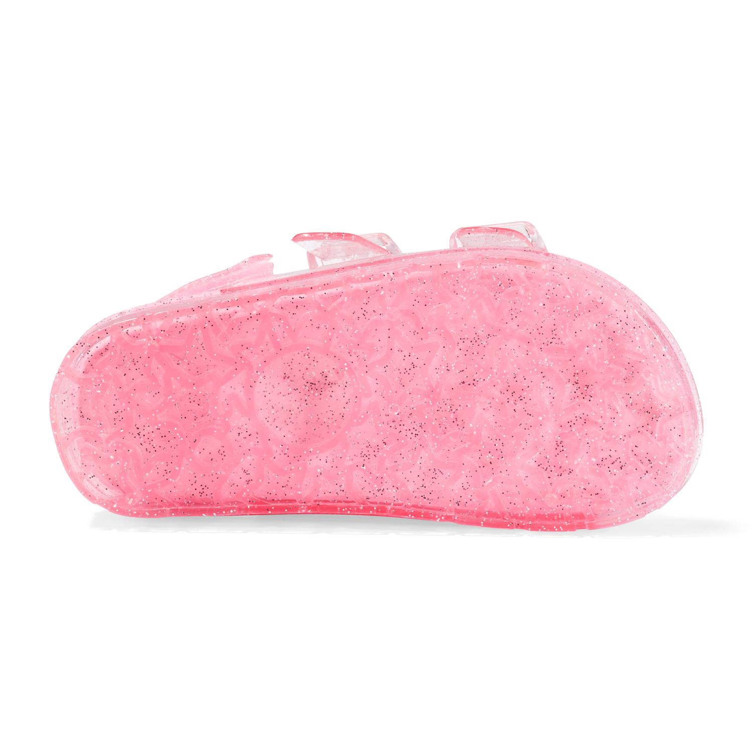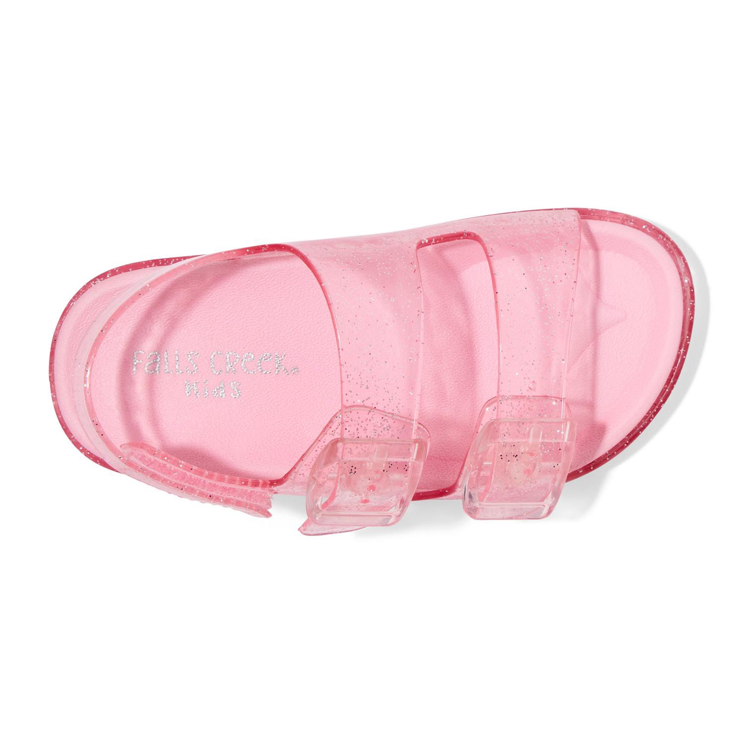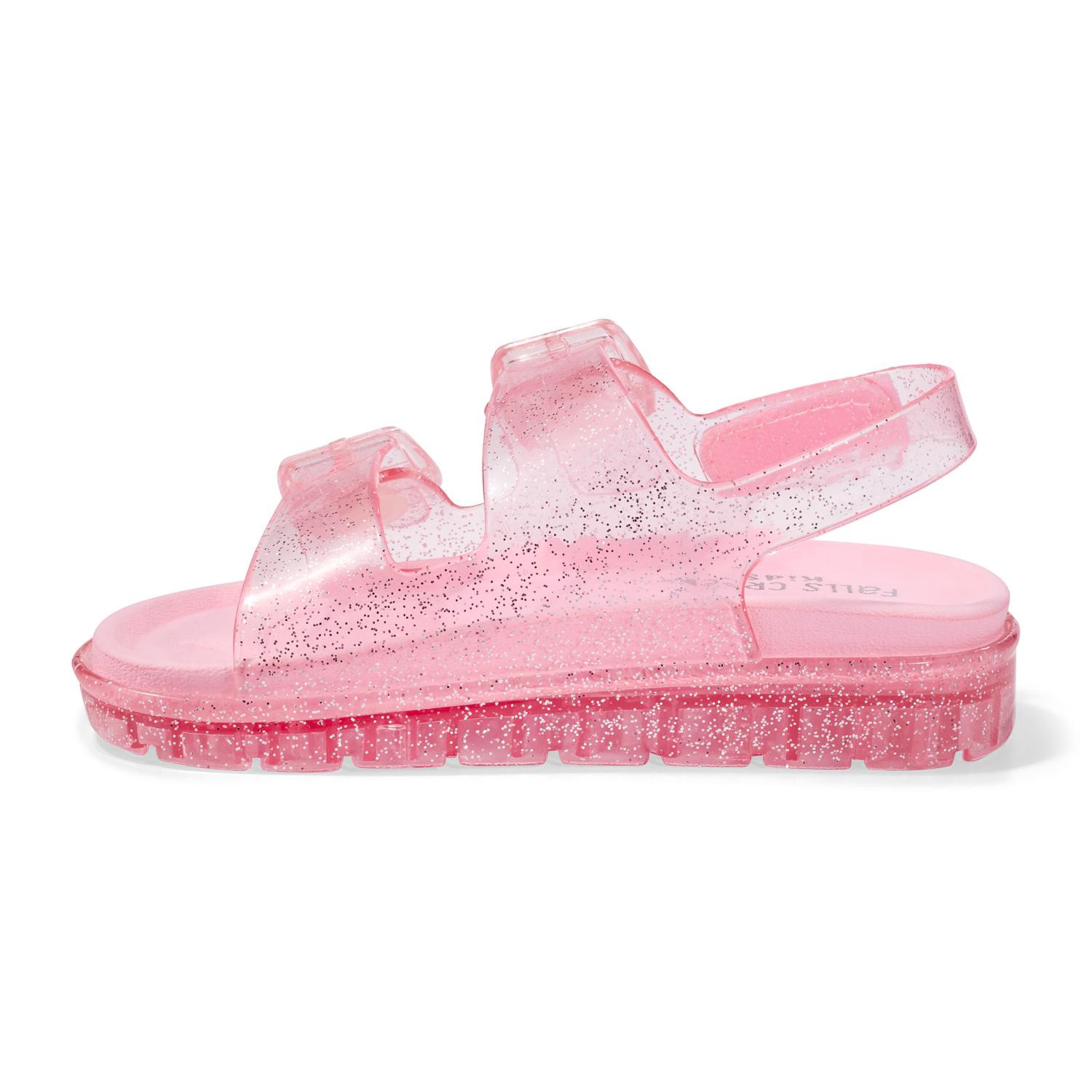 Translucent pink glitter jelly adjustable heel strap sandal gives her that pretty pop that goes with every outfit.