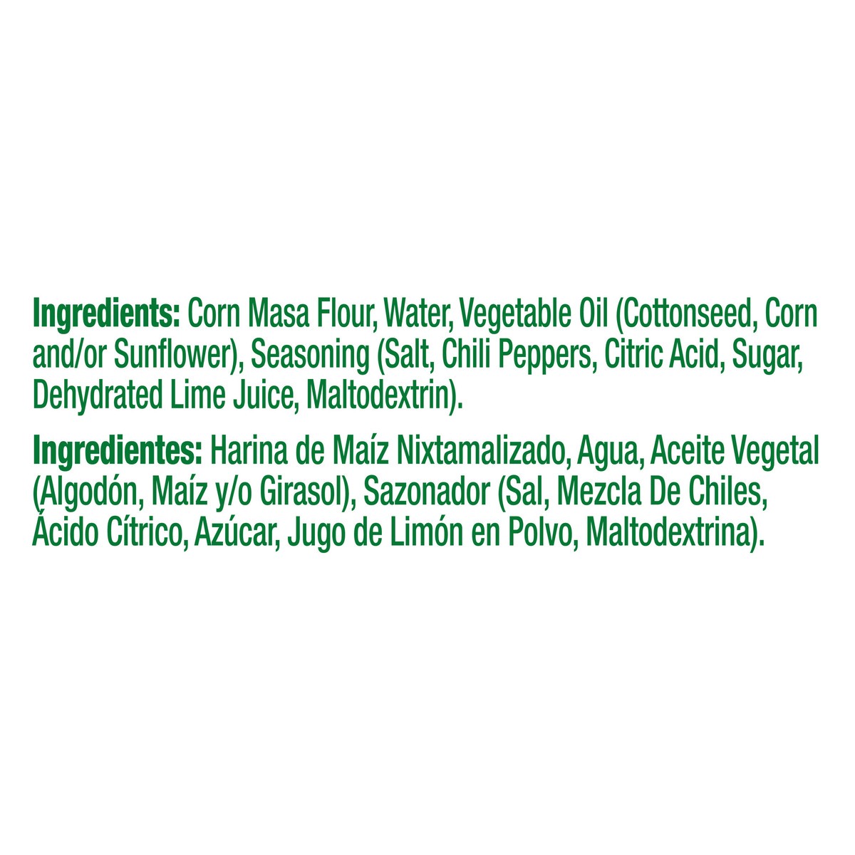 Corn Masa Flour, Water, Vegetable Oil (Cottonseed, Corn and/or Sunflower), Seasoning (Salt, Chili Peppers, Citric Acid, Sugar, Dehydrated Lime Juice, Maltodextrin).